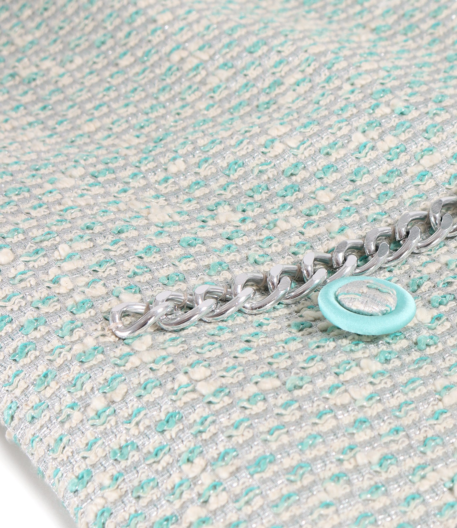 Sacou elegant din bucle de bumbac cu fir metalic argintiu, cu maneci 3/4 cu mansete suprapuse si cu lant argintiu decorativ in talie. Se inchide cu 4 nasturi pe mijloc fata.