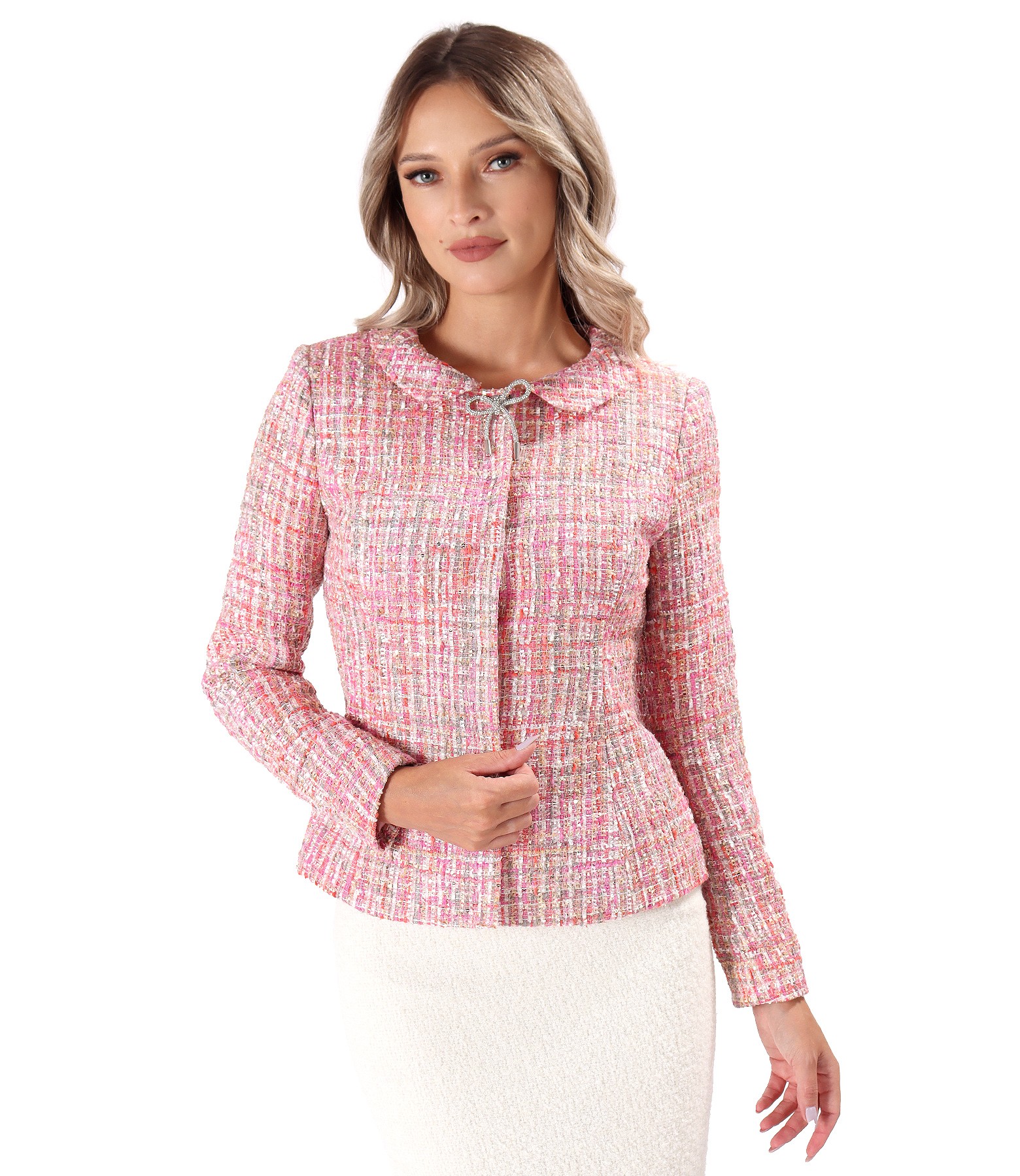 Sacou elegant din bucle multicolor cu fir metalic, captusit, cu guler rotund, si brosa cu cristale detasabila in forma de funda. Se inchide cu 5 capse pe mijloc fata.