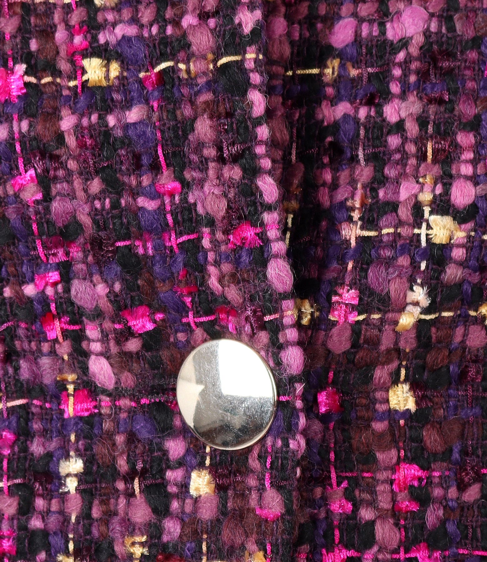 Sacou elegant din bucle multicolor cu lana, captusit, fara guler si cu decolteu pe langa gat. Se inchide cu un nasture pe fata.