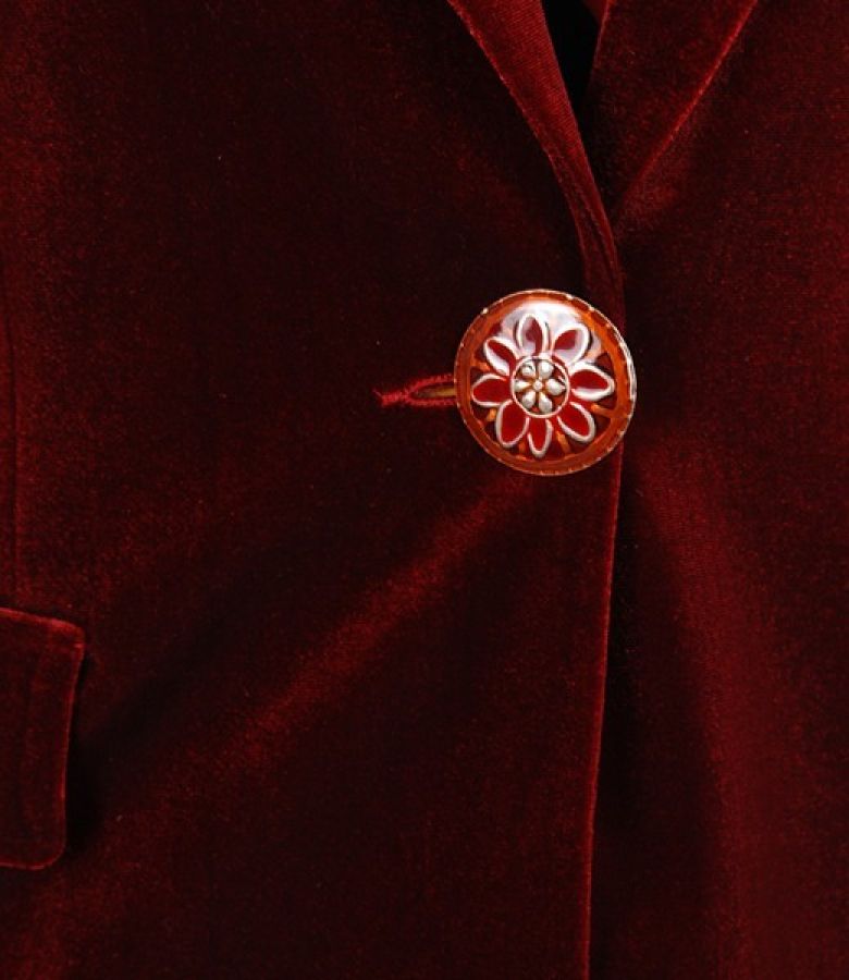 Sacou din catifea elastica, cu decolteu adanc, in V si doua clape laterale aplicate pe fata. Guler si rever ascutite. Se inchide cu un nasture pe mijloc fata.