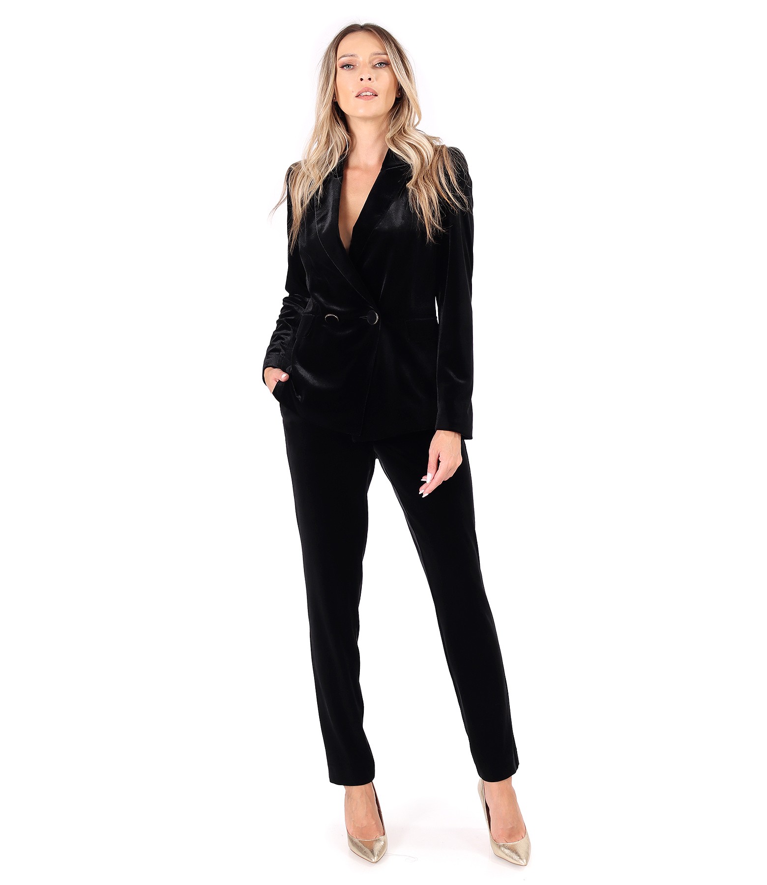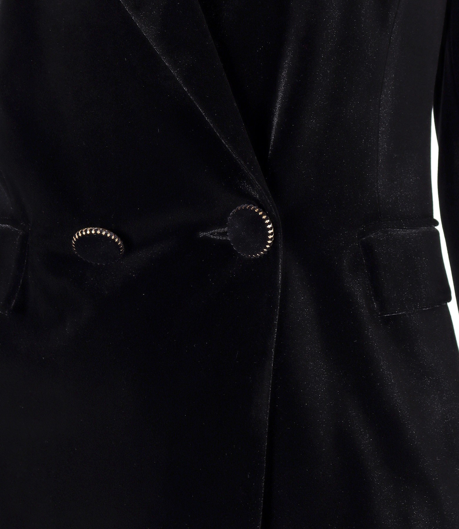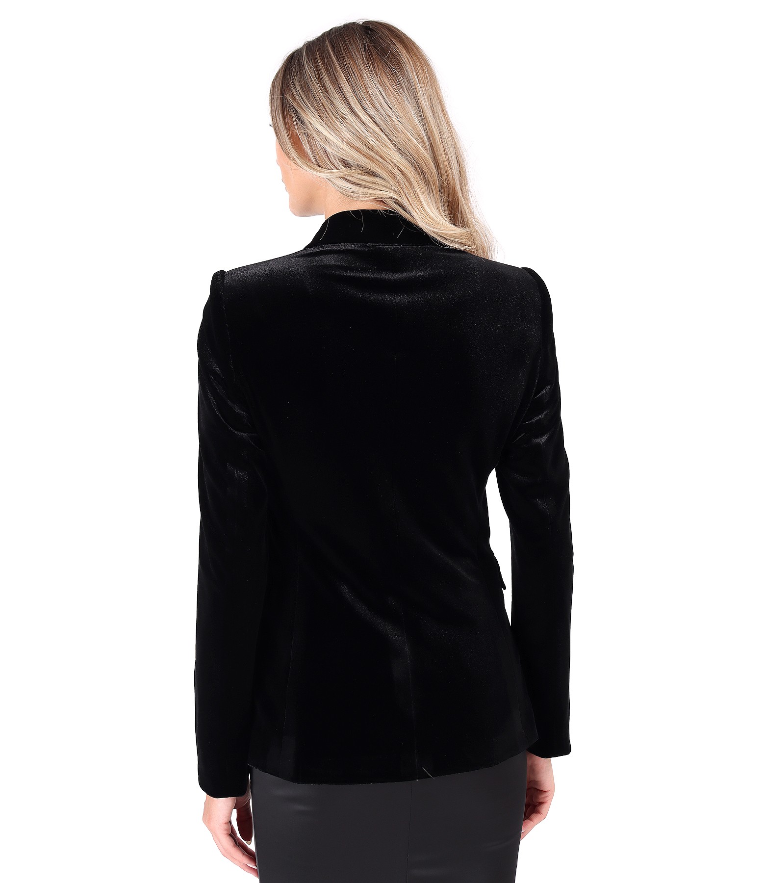 Sacou elegant din catifea elastica neagra, captusit, cu guler si revere. Se inchide cu 1 nasture si contra-nasture.
