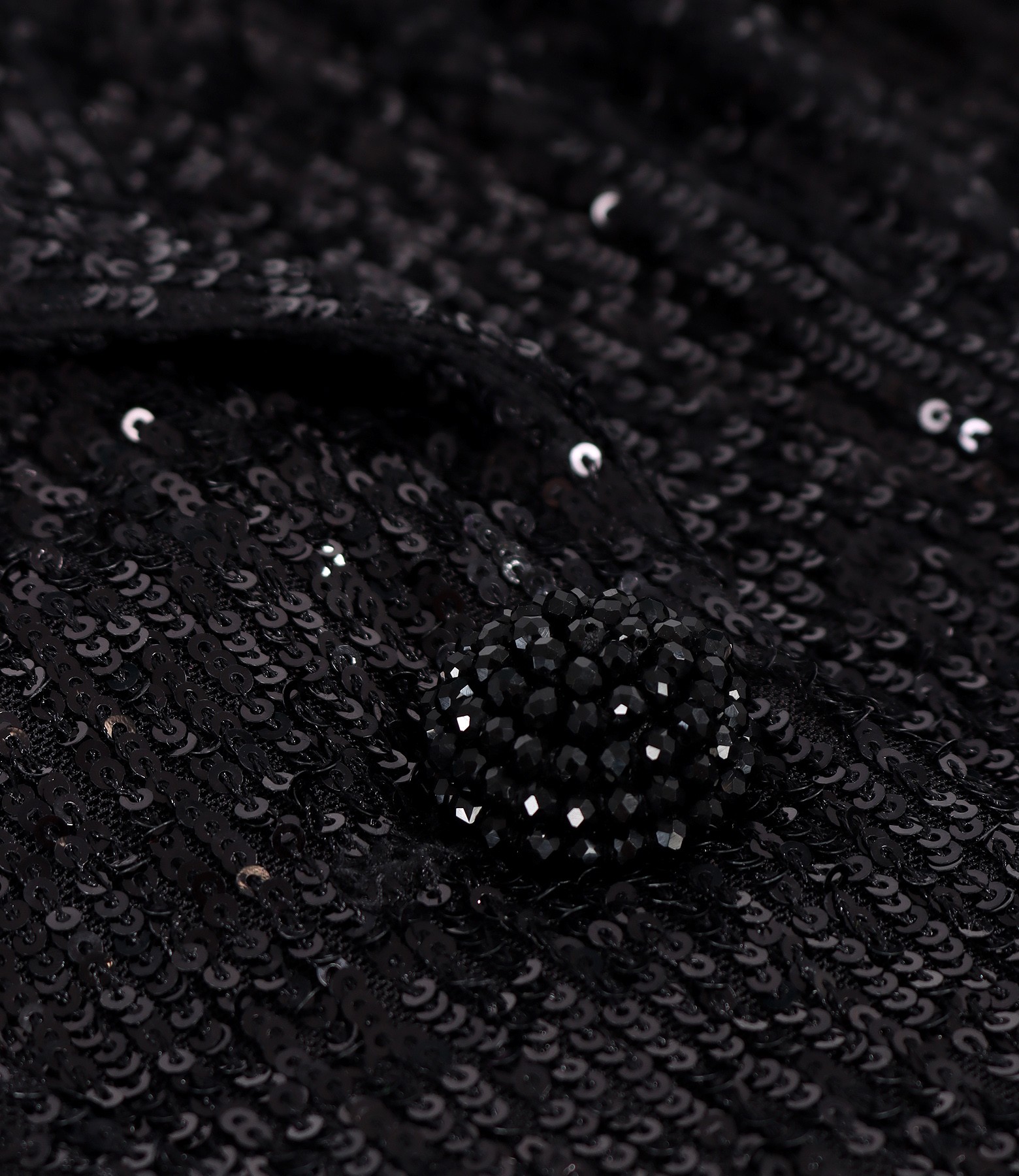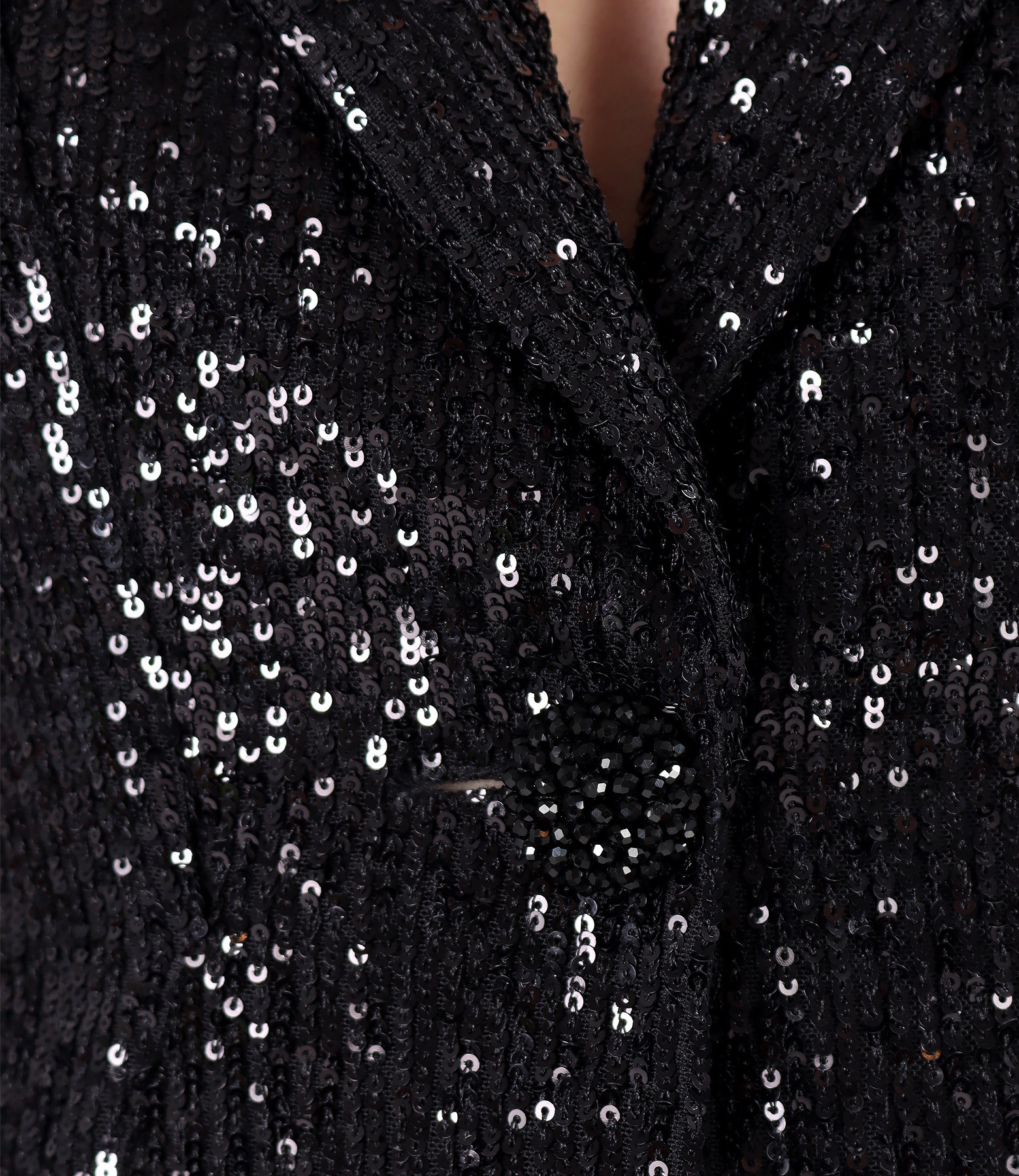 Sacou elegant din paiete metalizate negre, captusit cu saten, cu decolteu adanc. Se inchide cu un nasture pe fata.