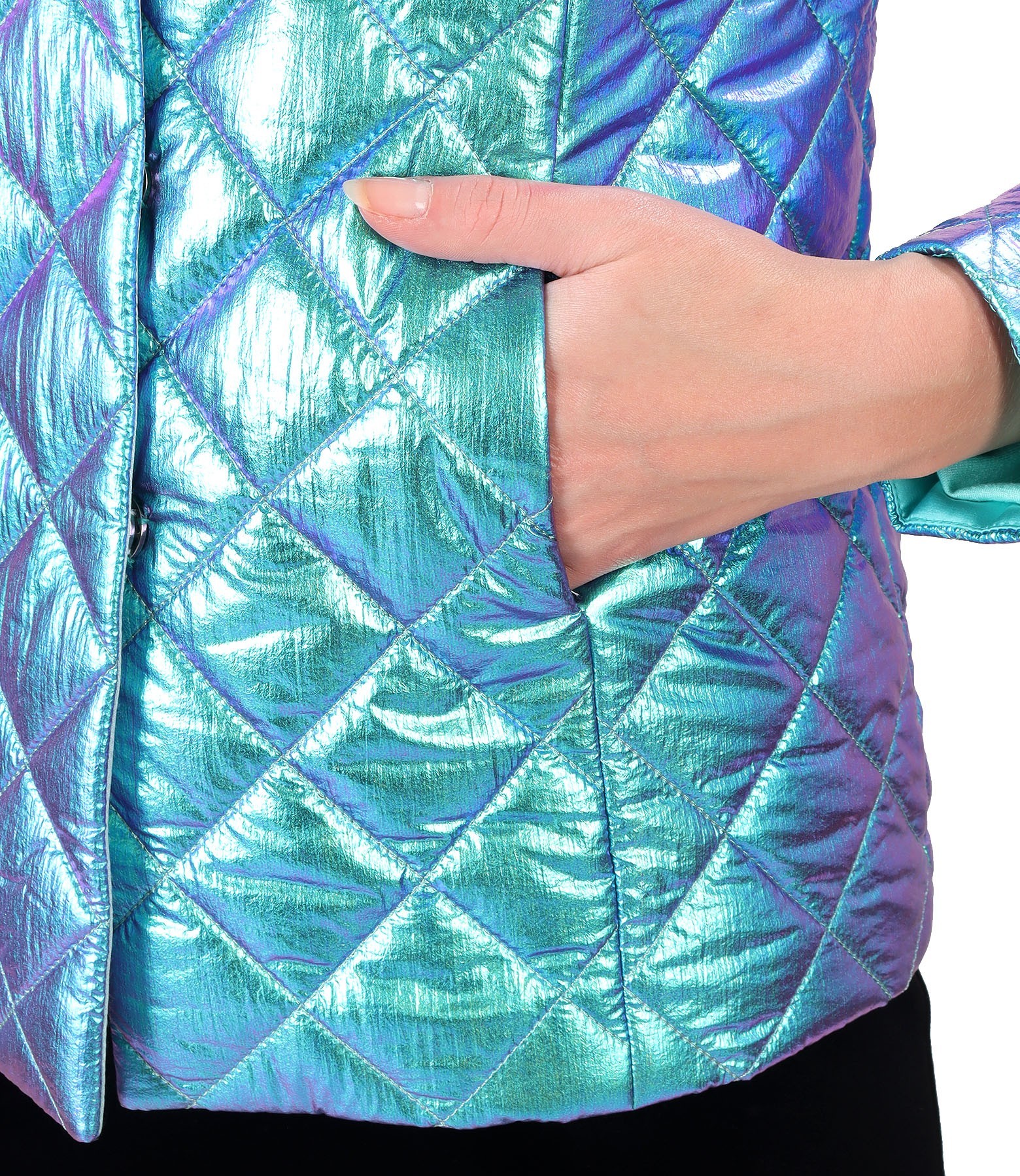 Sacou elegant din tesatura matlasata impermeabila cu efect changeant, dublata cu jerse elastic, cu maneci lungi si buzunare laterale. Se inchide cu 5 perechi de capse pe mijloc fata. Nu necesita calcare.