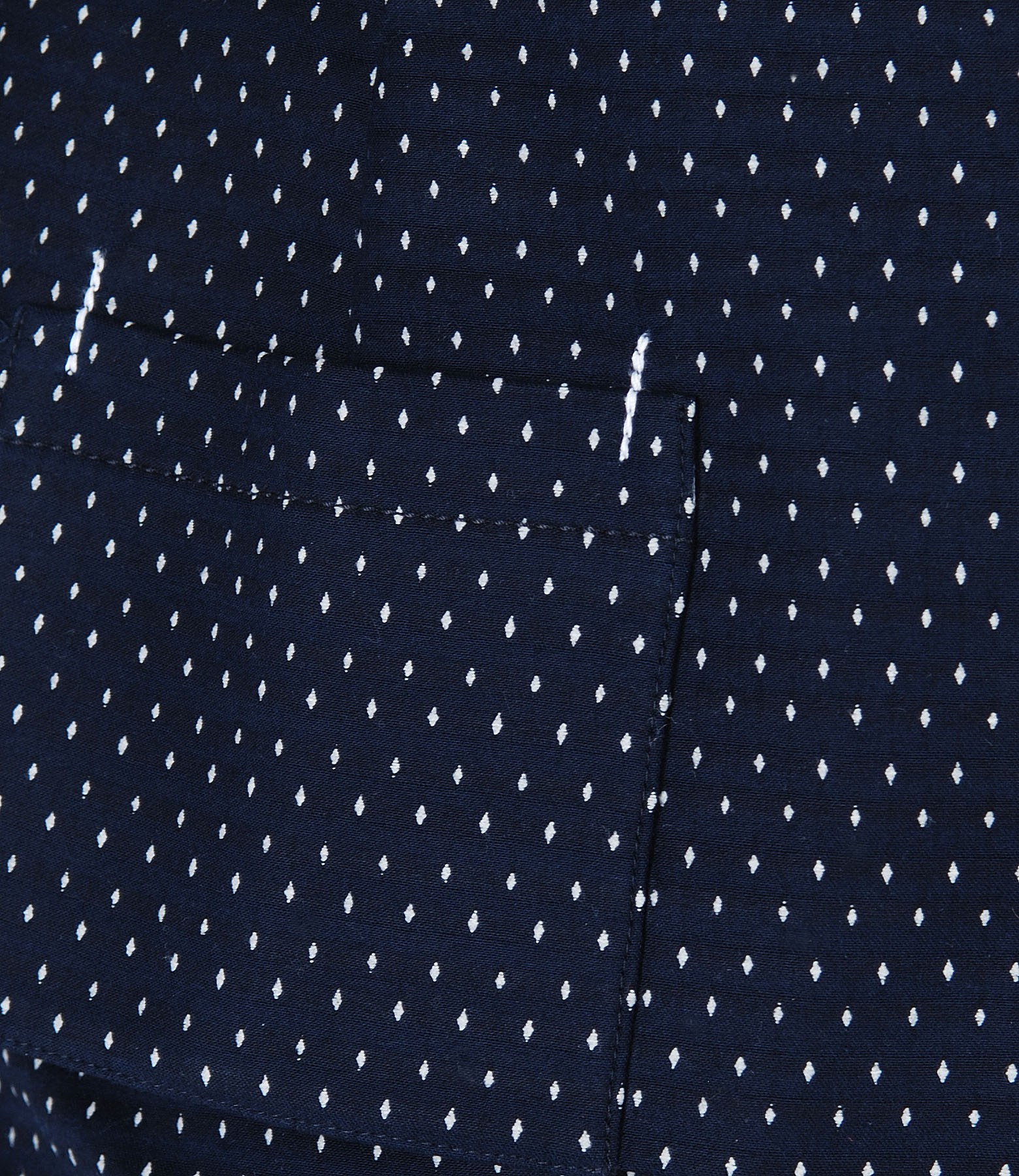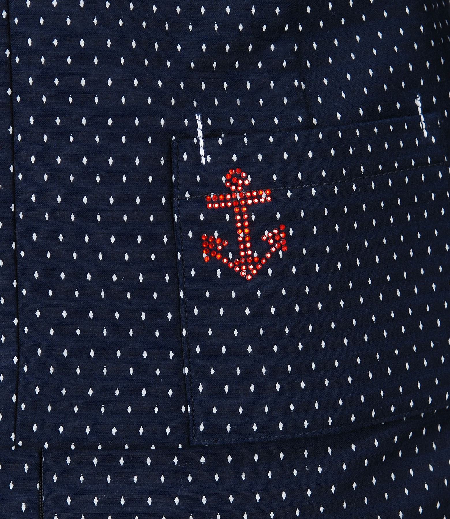 Sacou necaptusit, din bumbac elastic imprimat cu picouri, cu maneci lungi, decolteu adanc, buzunare aplicate la terminatie spate cu aplicatie ancora. Se inchide cu un nasture pe fata.