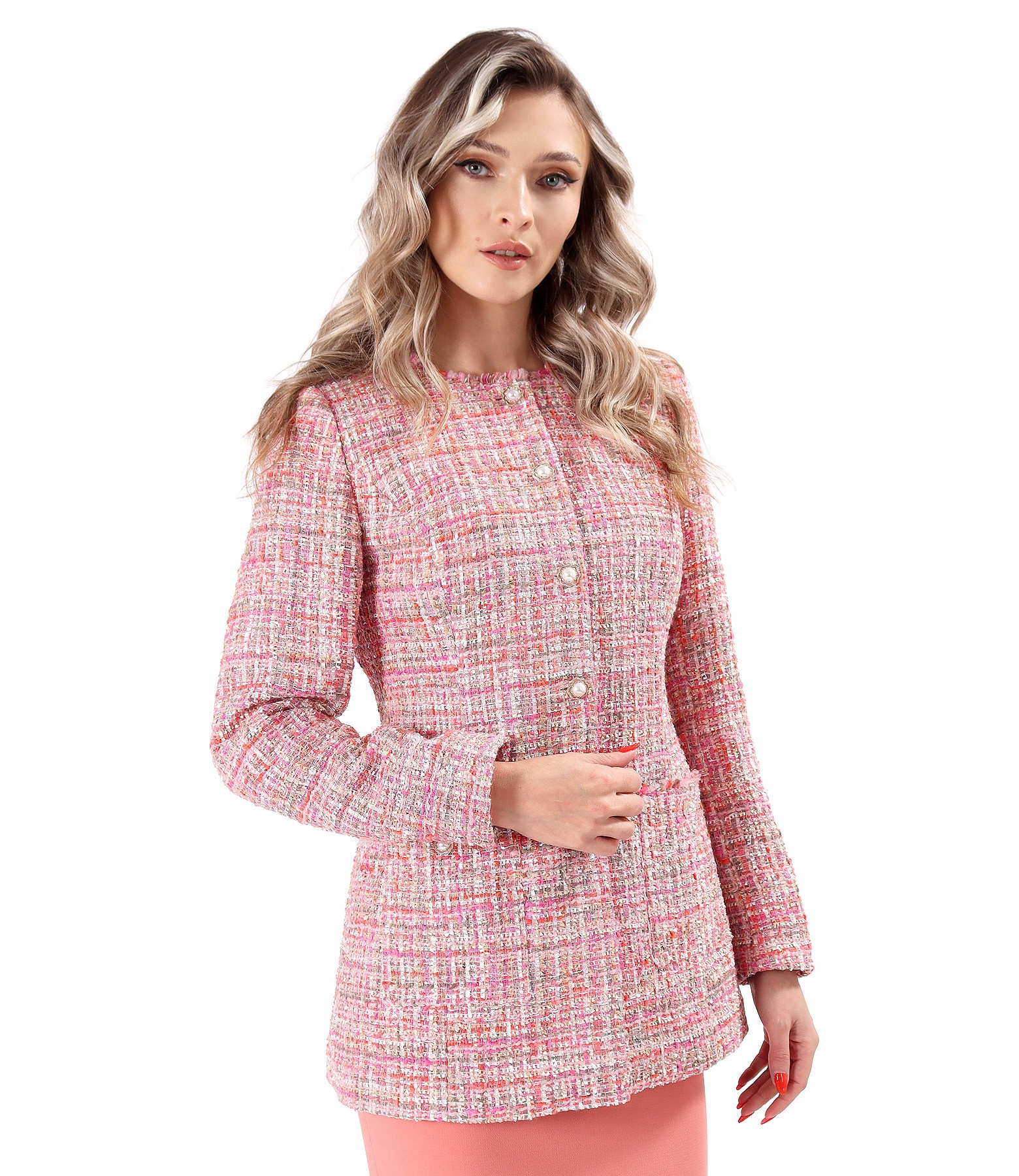 Sacou lung din bucle multicolor cu fir metalic, buzunare aplicate pe fata cu nasture decorativ, si cu decolteu pe langa gat. Sacoul are franjuri la buzunare si la decolteu. Se inchide cu 5 nasturi pe mijloc fata.
