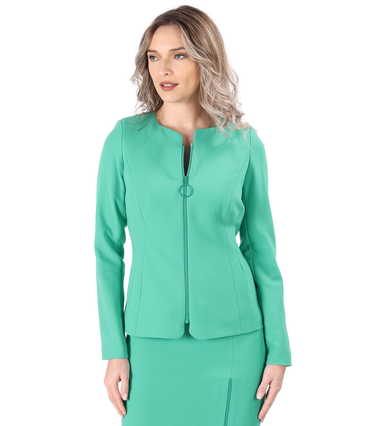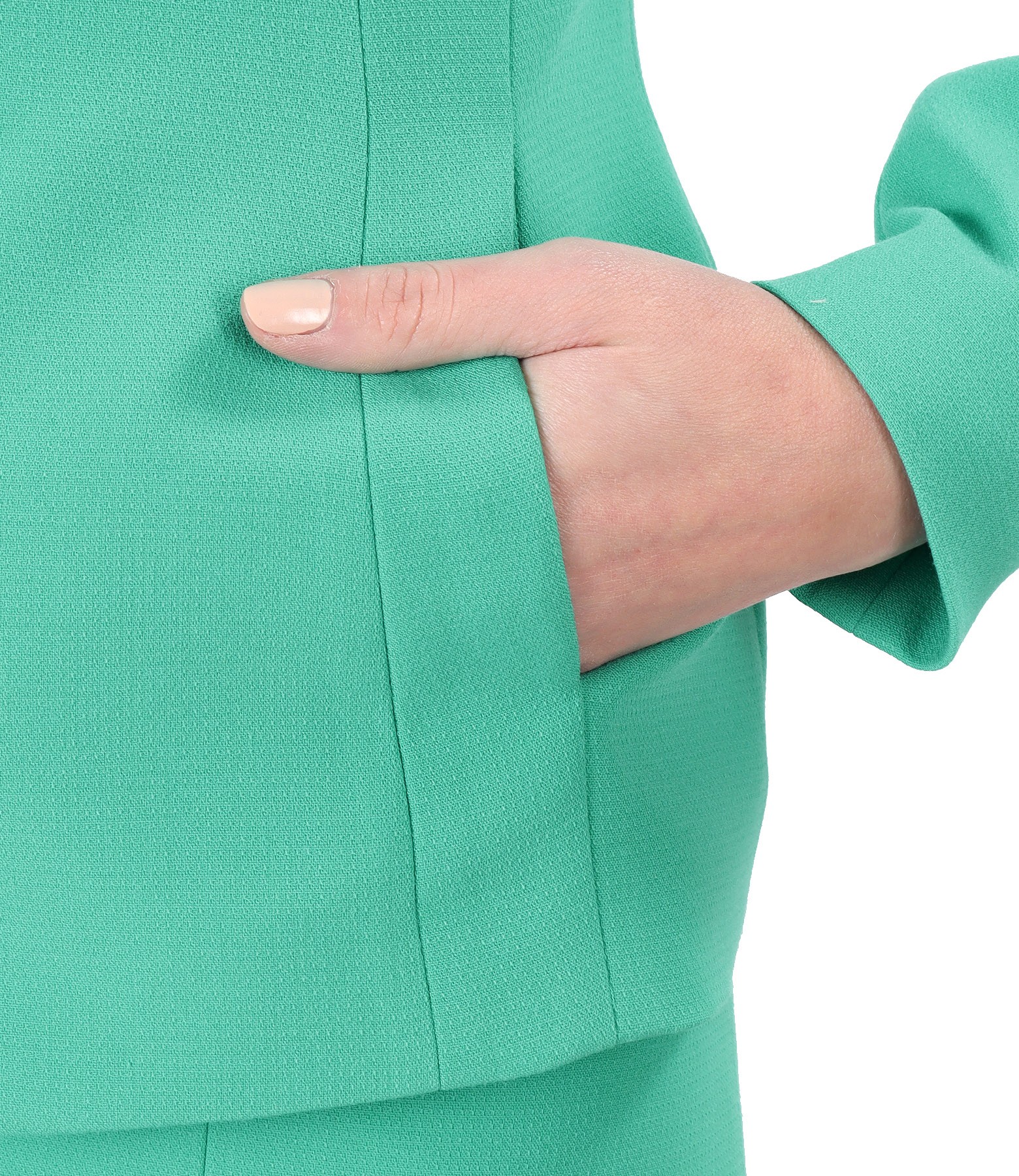 Sacou office din stofa elastica, captusit, cu buzunare laterale. Se inchide cu fermoar din plastic pe mijloc fata.