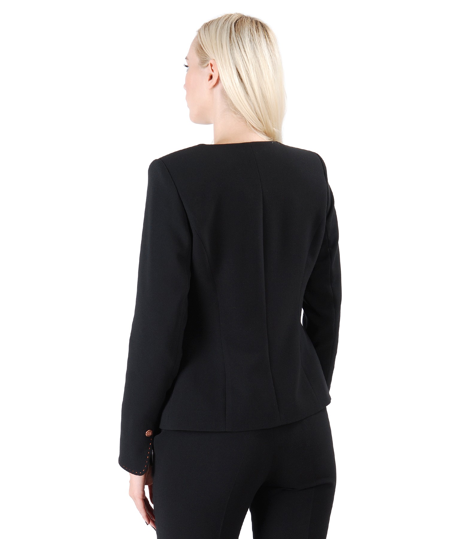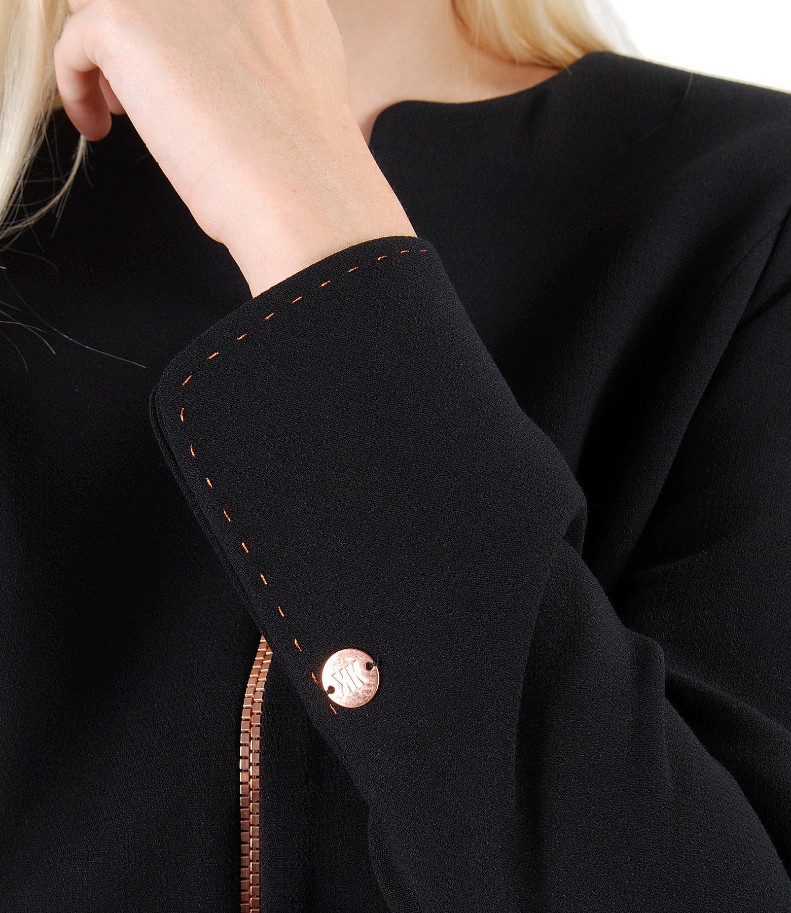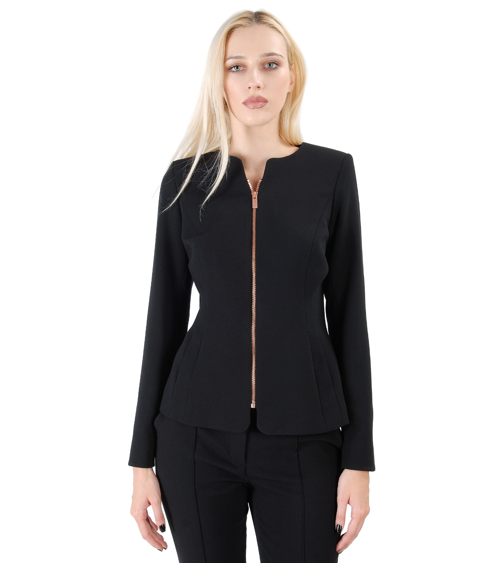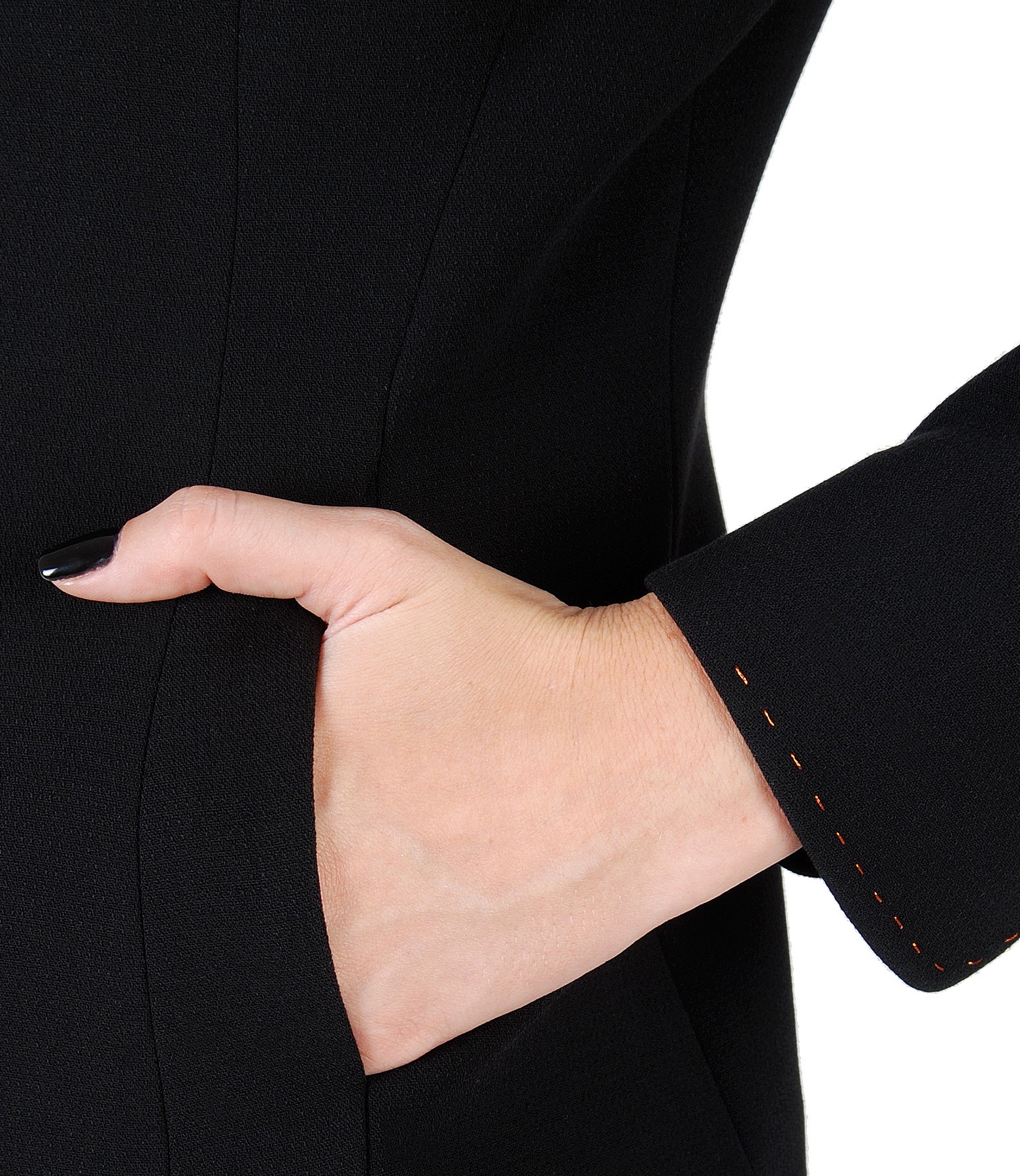 Sacou office din stofa elastica, captusit, cu slit la terminatie maneci si buzunare laterale. Se inchide cu fermoar cu cheie metalica pe mijloc fata.