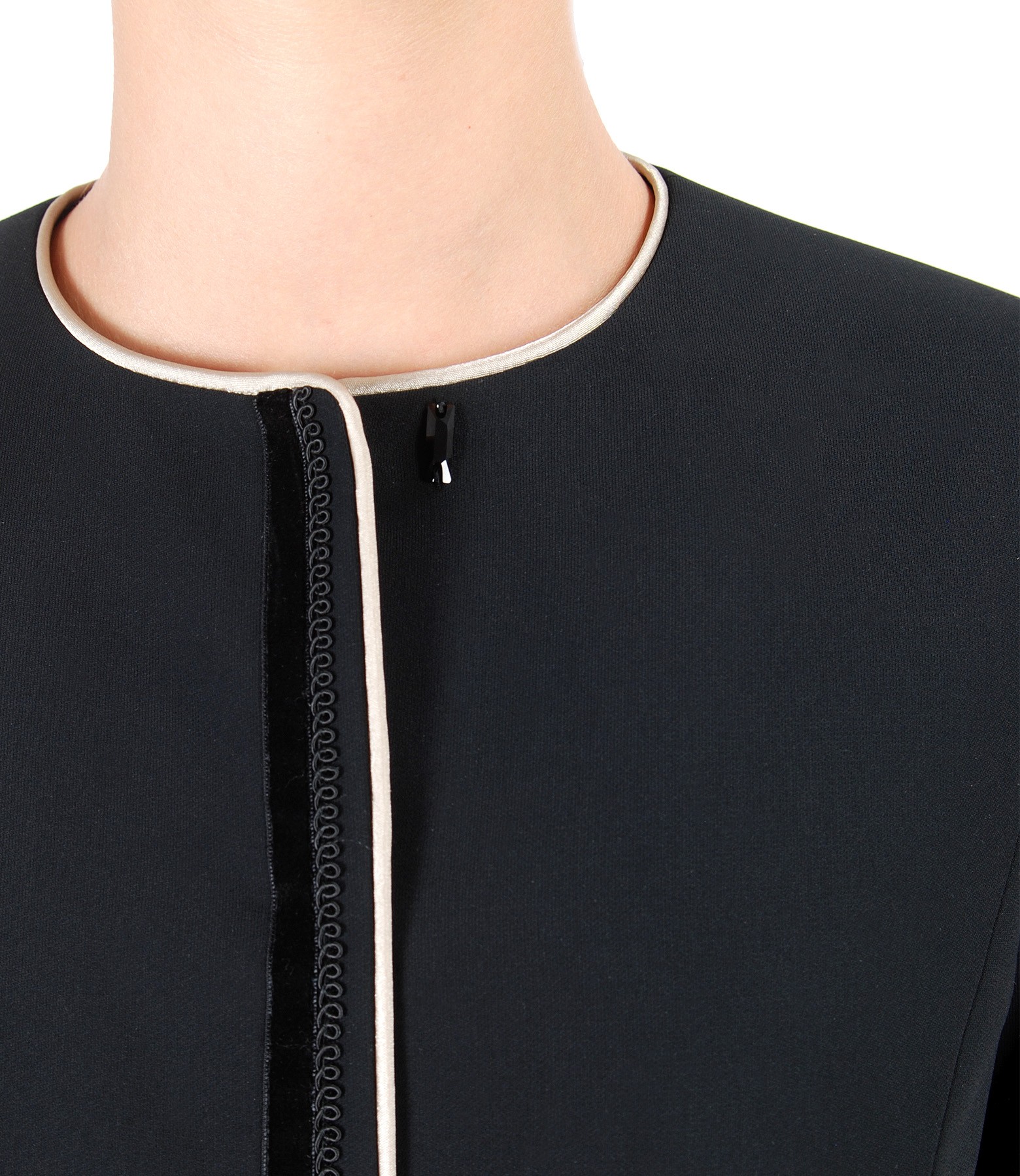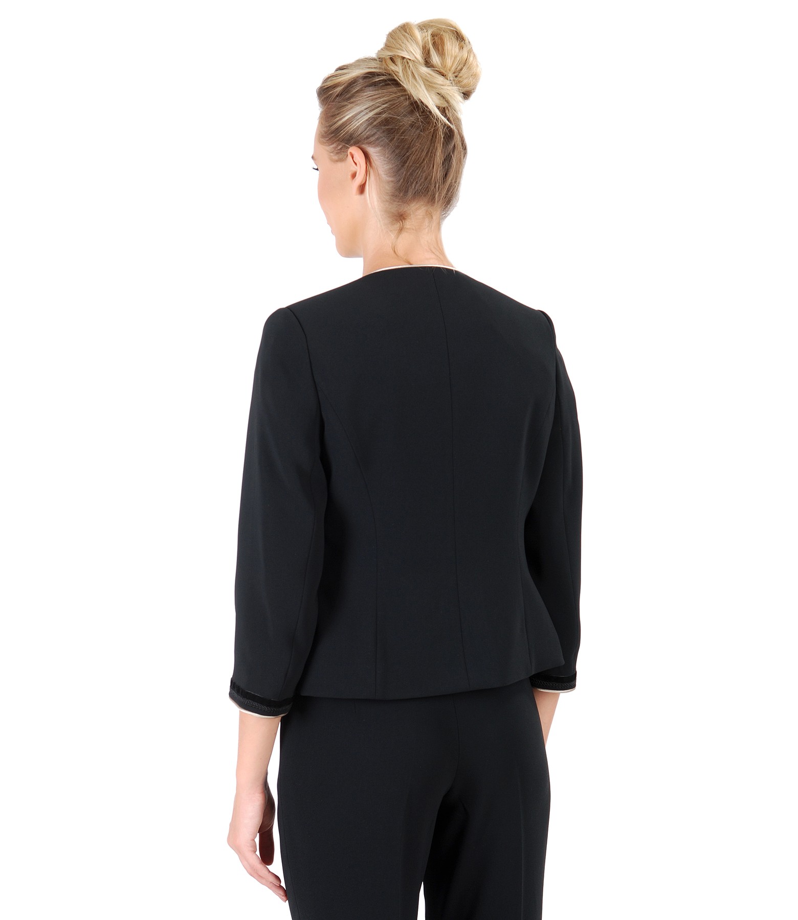 Sacou office, captusit, fara guler si revere, cu garnitura la terminatie, maneci 3/4 si aplicatie de cristale pe decolteu. Se inchide pe fata cu 5 capse mos-baba, pana la baza decolteului.