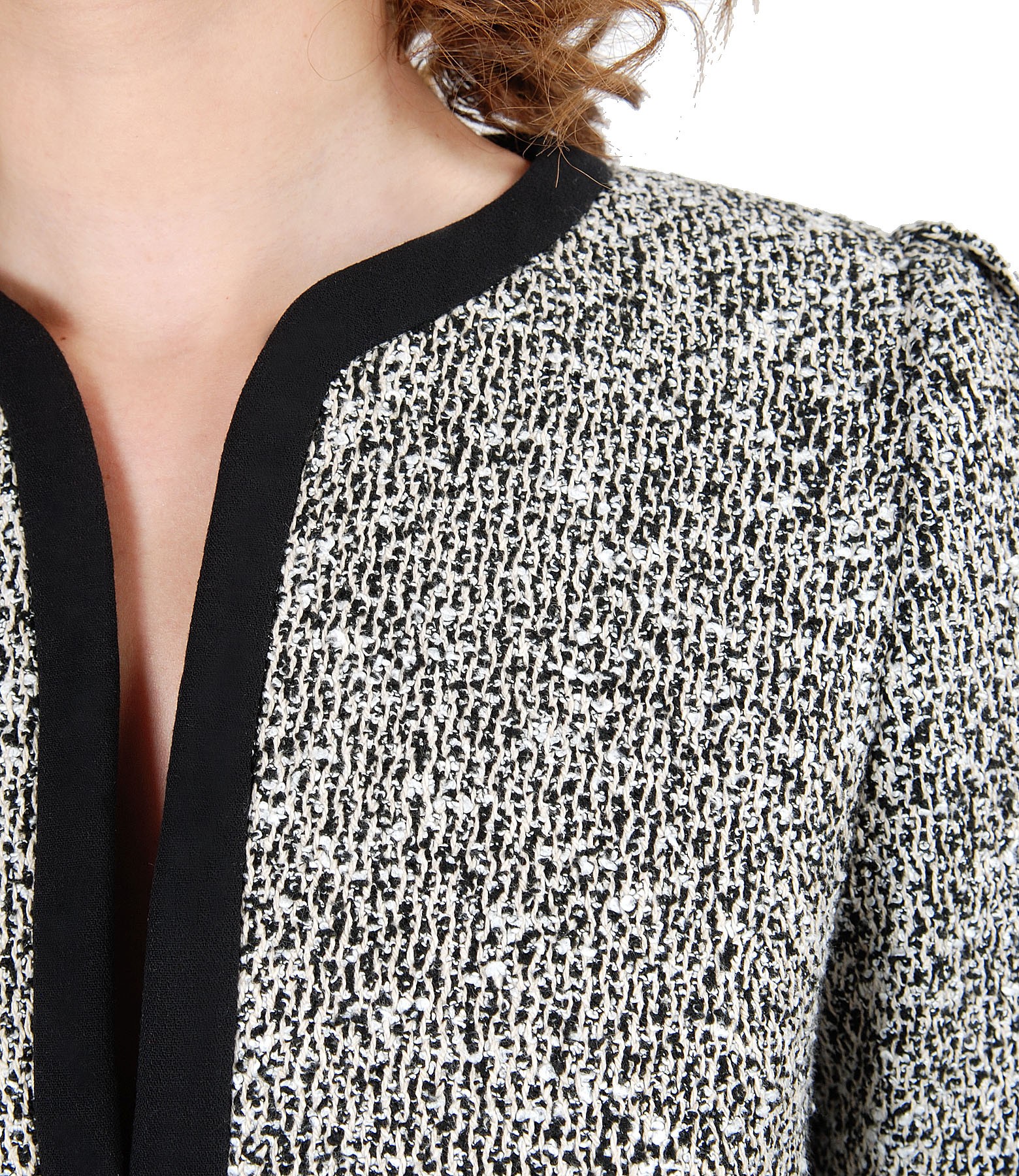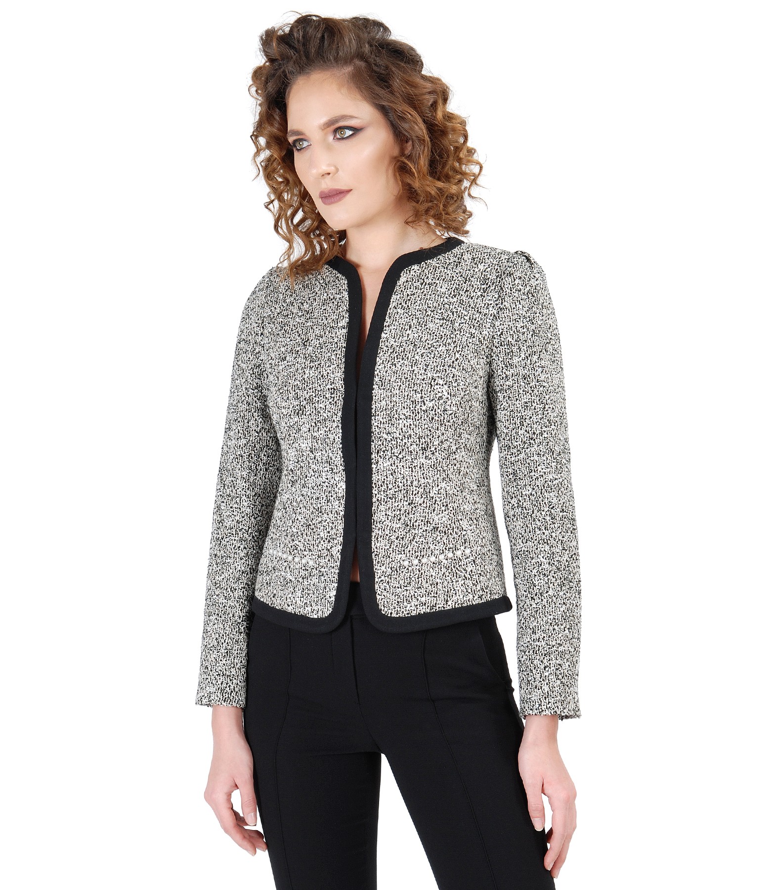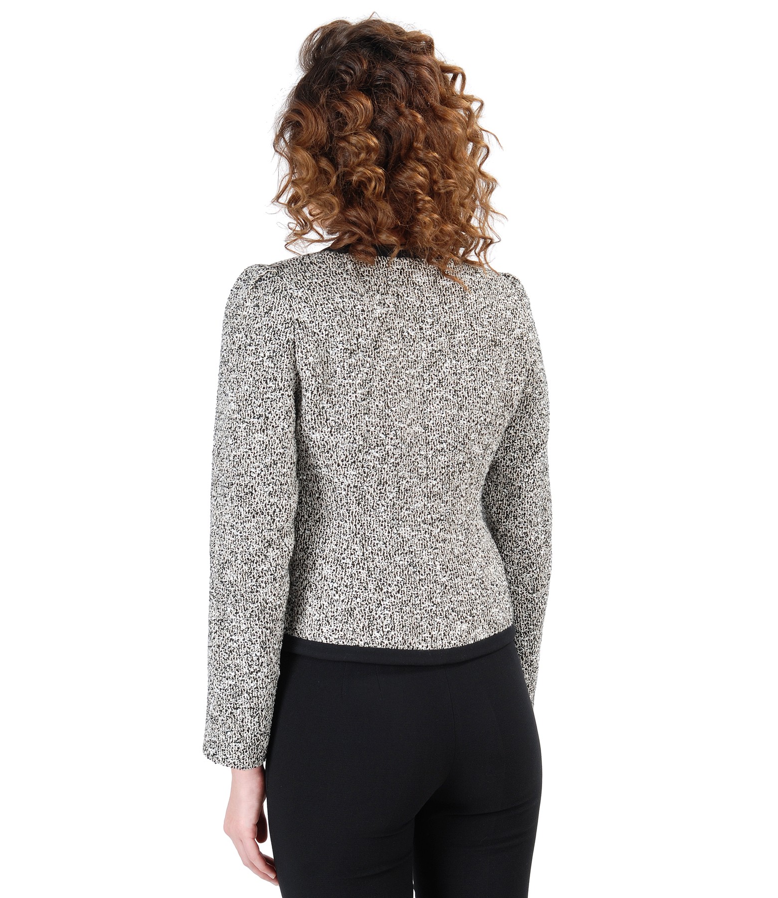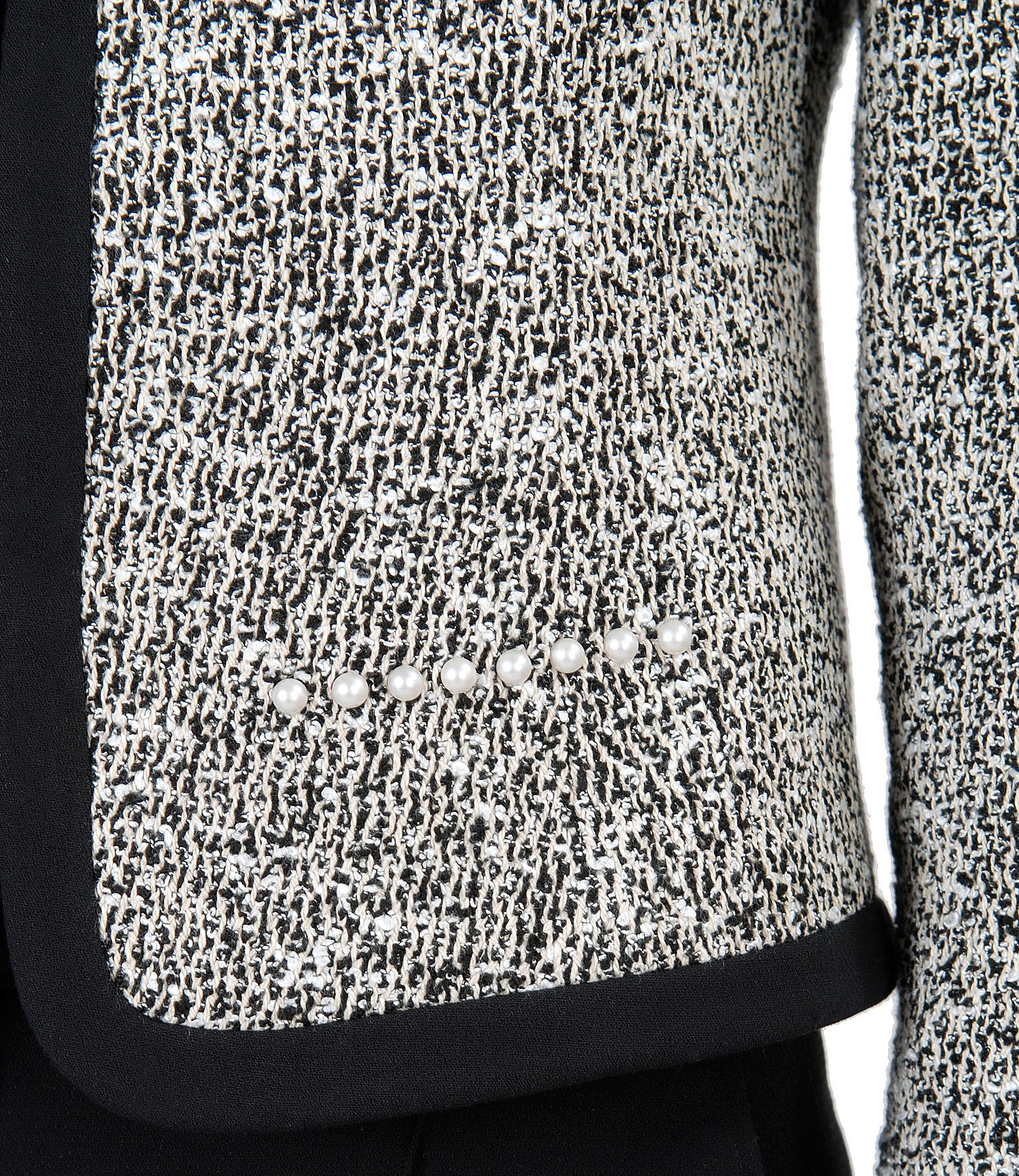 Sacou office din bucle cu bumbac, fara guler, cu garnitura pe cant si la terminatie si cu aplicatie de perle pe fata. Se inchide pe fata cu 3 capse pana la nivelul bustului.