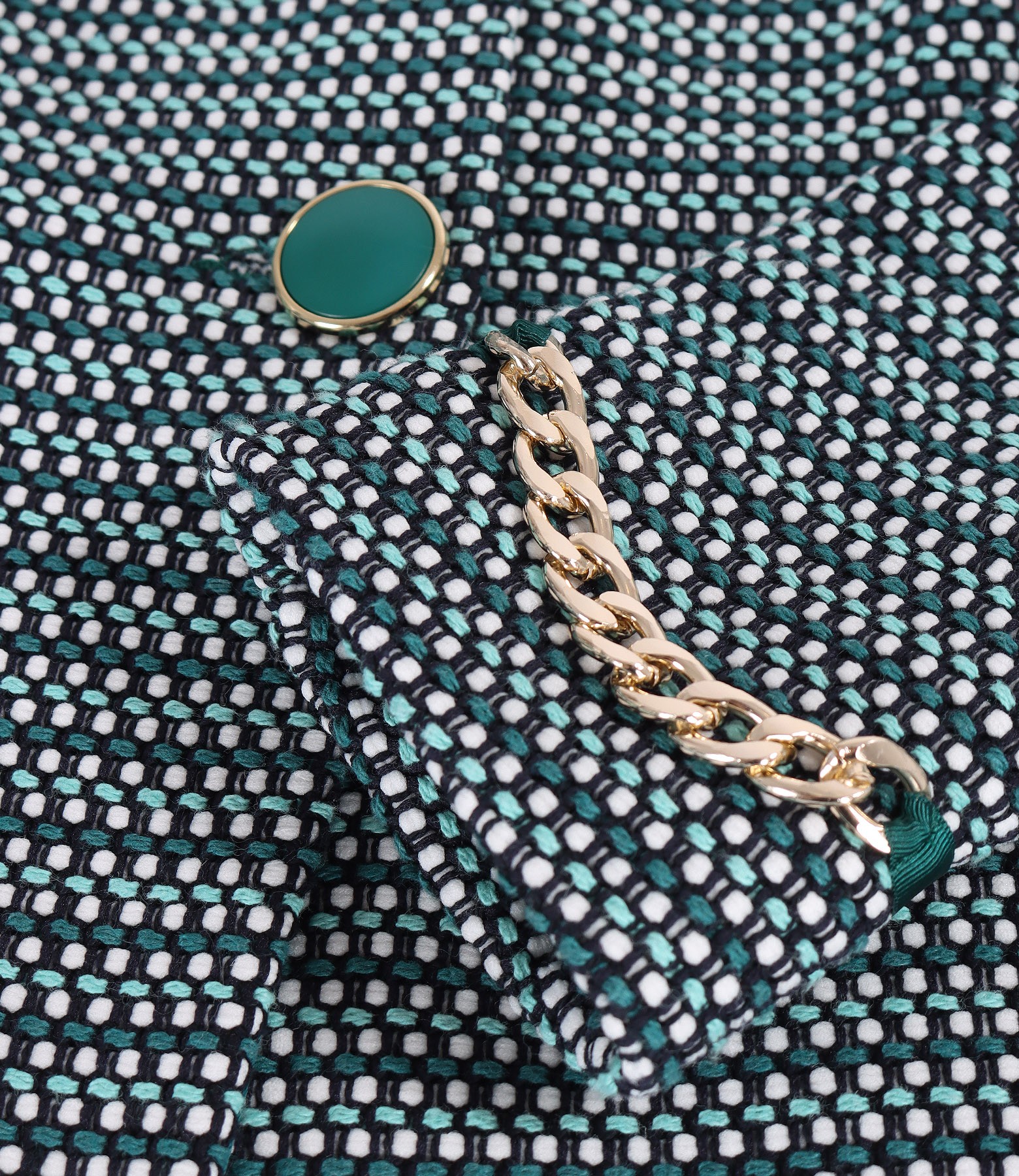 Sacou din bucle cu bumbac, cu decolteu pe langa gat, cu lant si rips la terminatie maneci. Se inchide pe fata cu 1 nasture.
