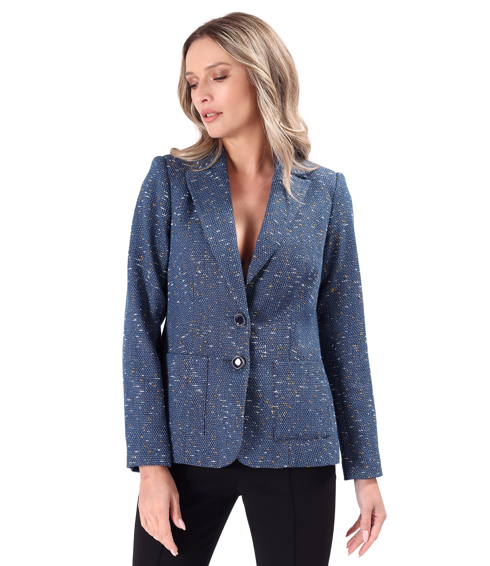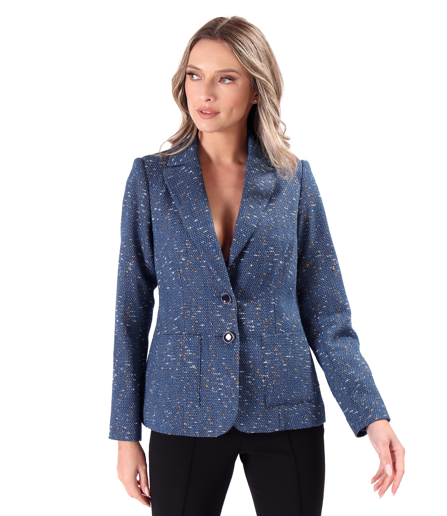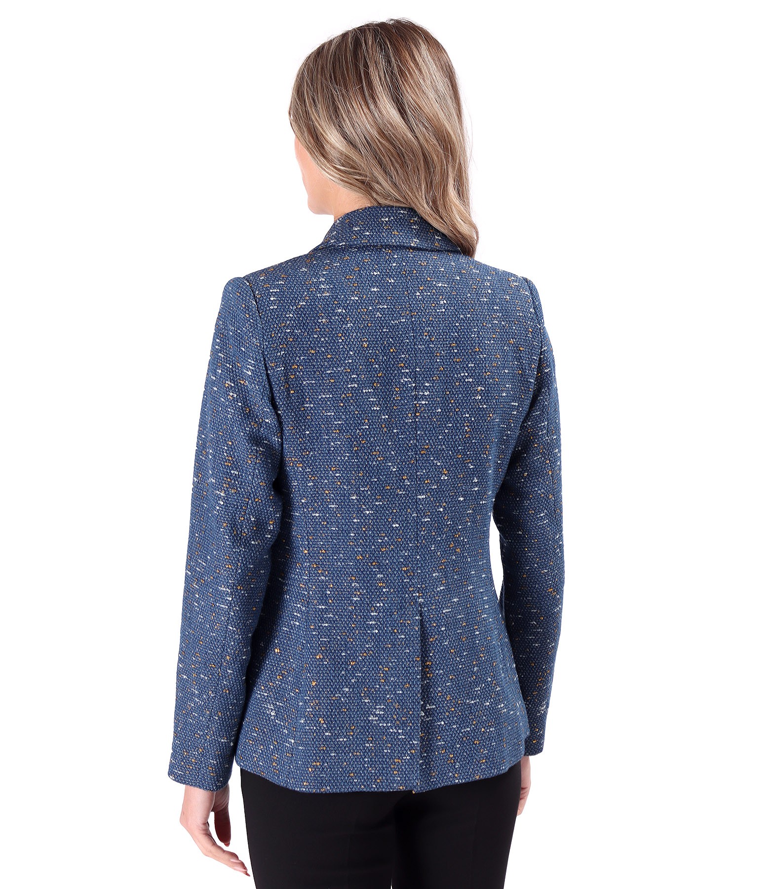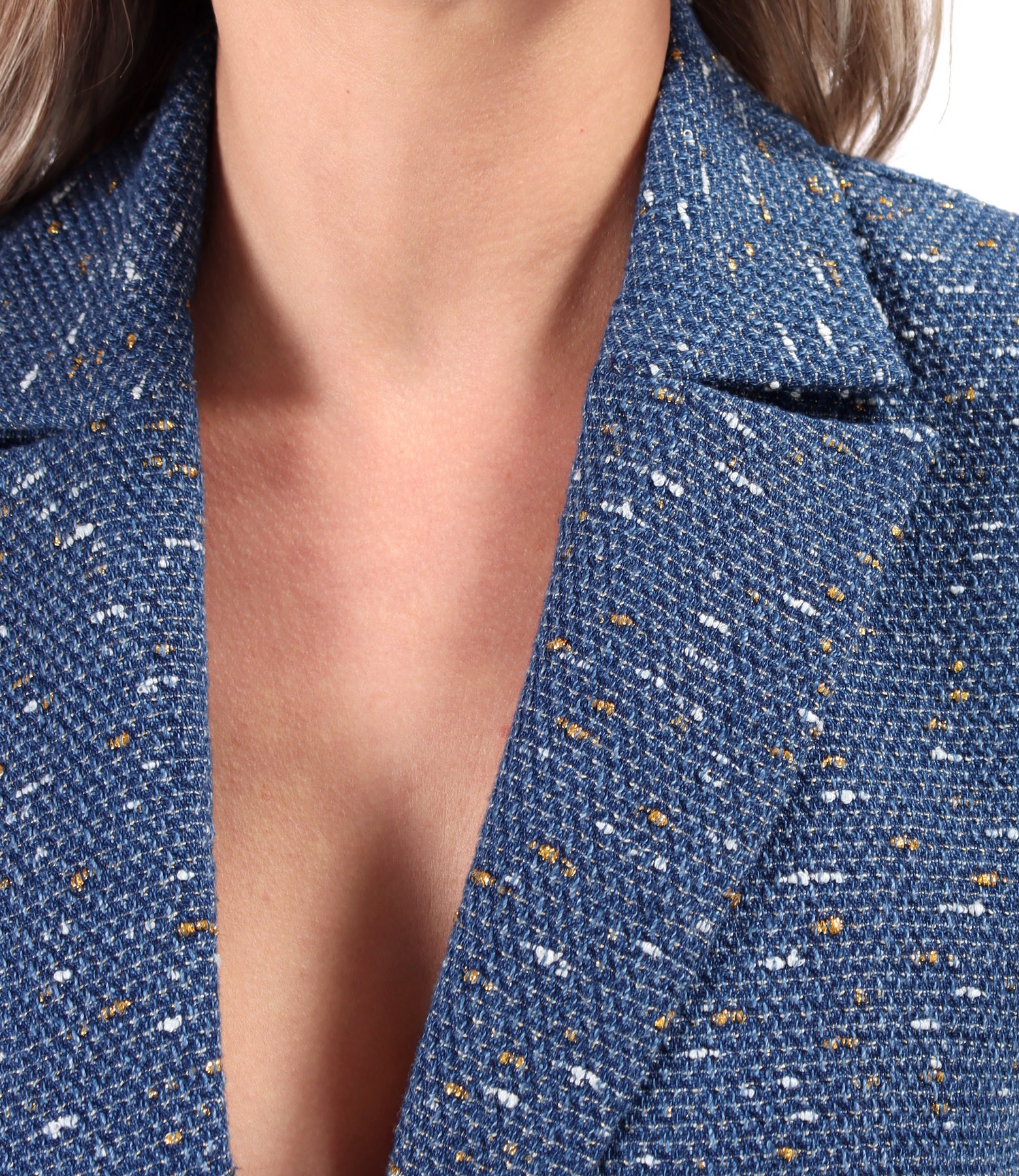 Sacou office din bucle cu bumbac, captusit, cu decolteu adanc, buzunare aplicate pe fata si slit petrecut pe mijloc spate. Se inchide cu doi nasturi pe fata.