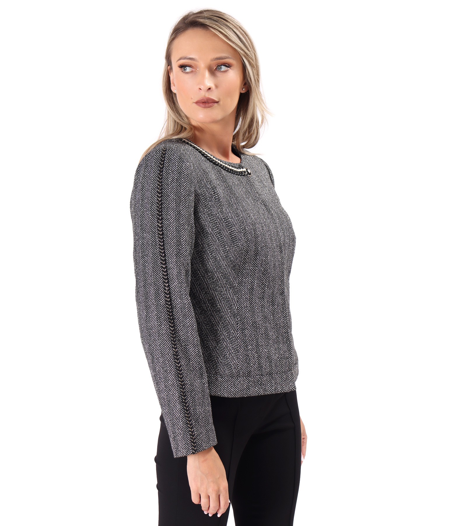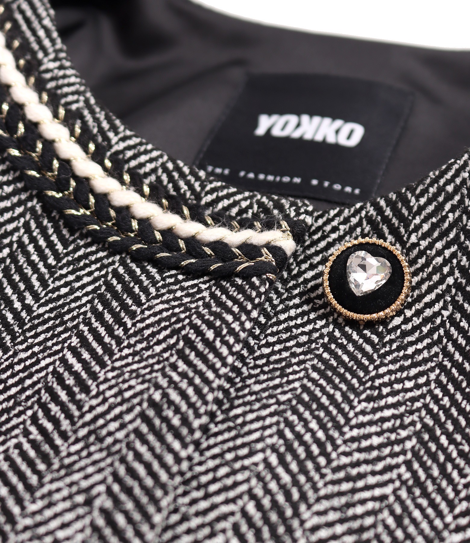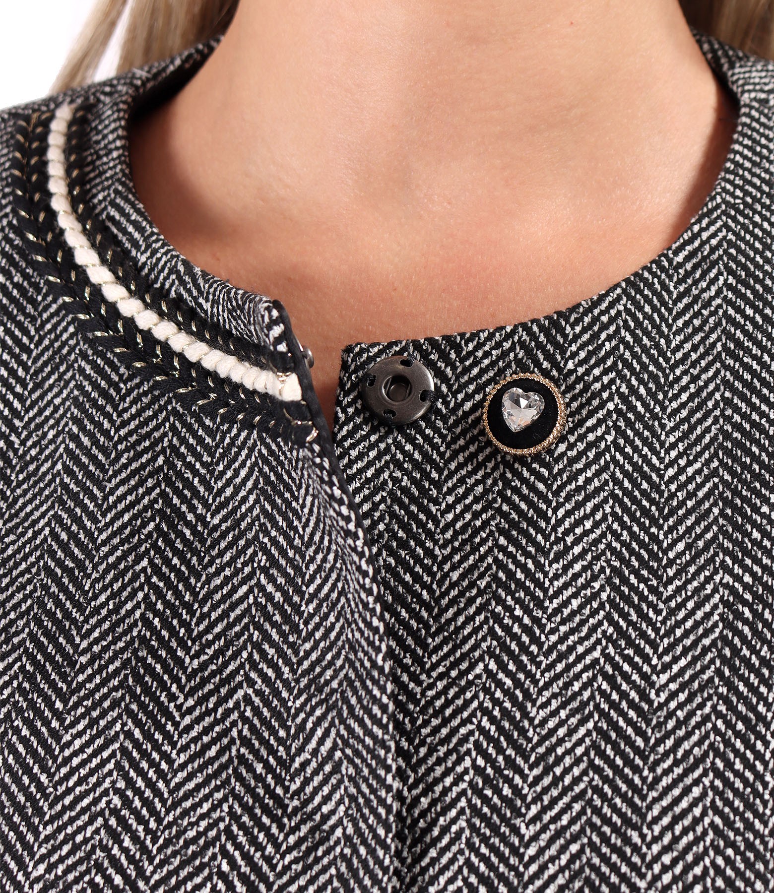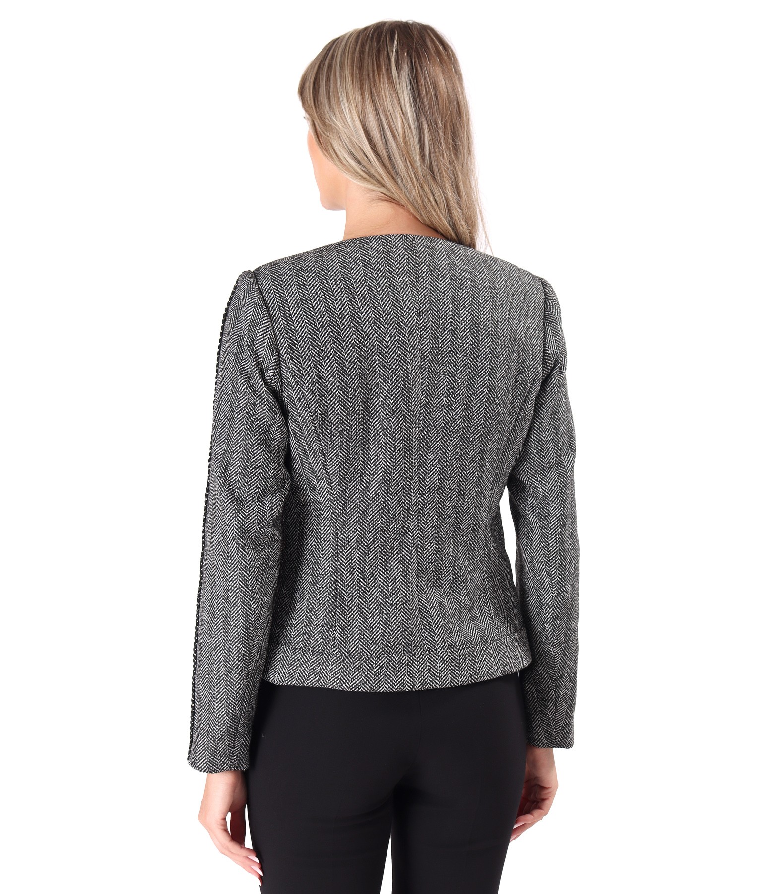 Sacou office din bucle cu bumbac, fara guler, captusit, cu decolteu pe langa gat si cu nasture dcorativ la decolteu. Sacoul are banda decorativa negru cu auriu la decolteu si pe maneci. Se inchide cu 5 capse pe fata.