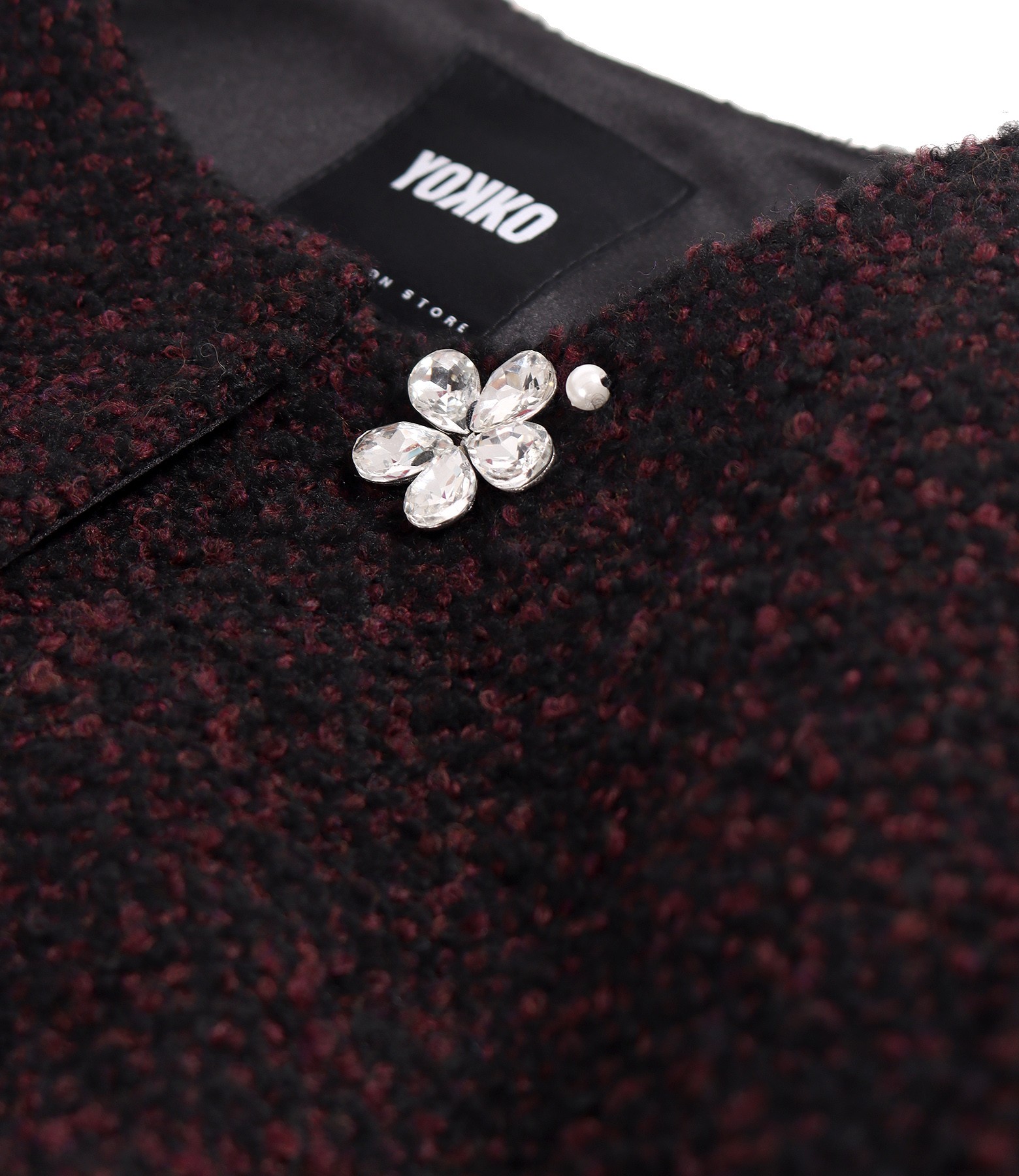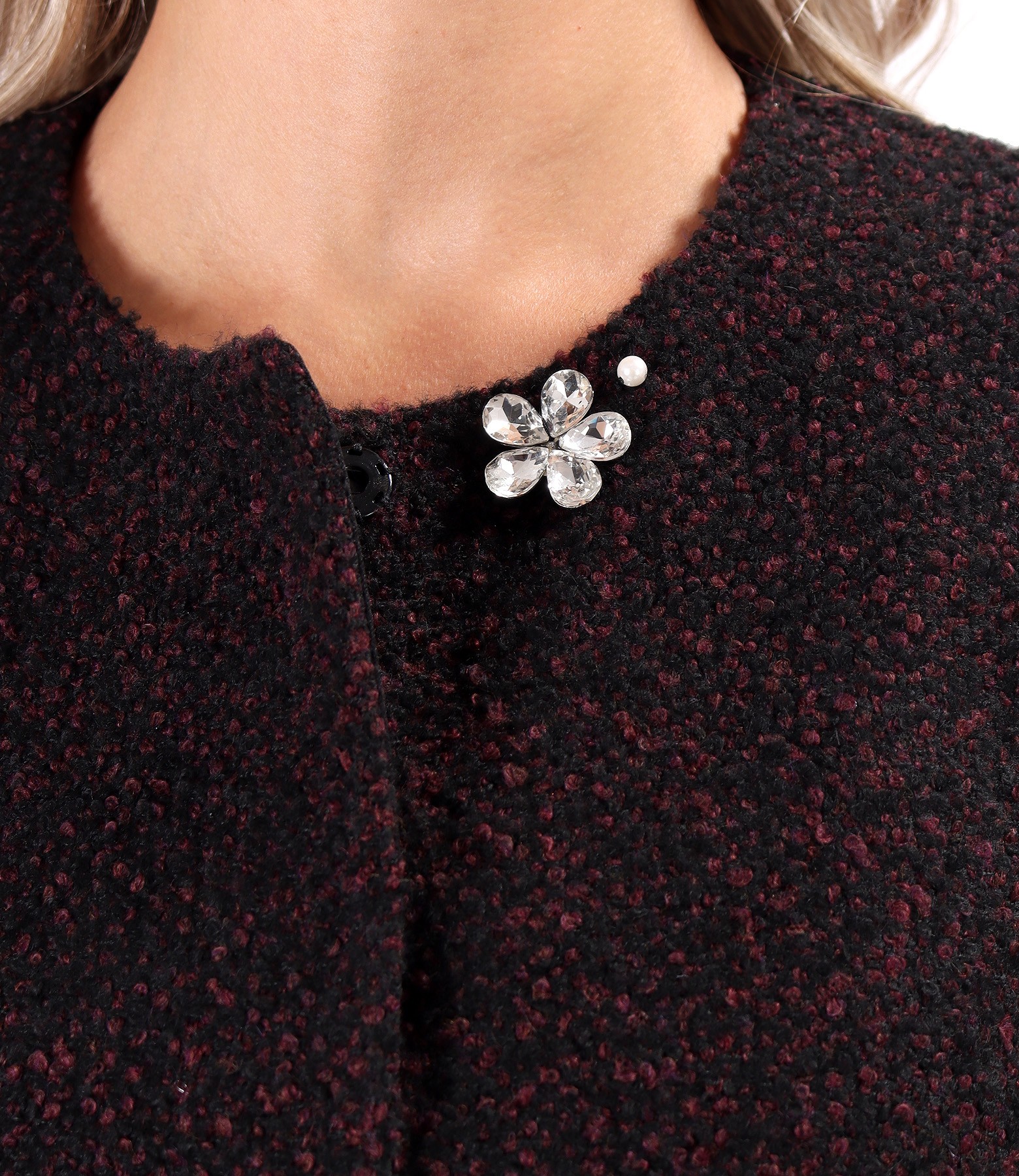 Sacou office din bucle cu lana, fara guler, captusit, cu decolteu pe langa gat, cu cristale in forma de floare si perla cusute la decolteu, si cu pasmanterie cu perle pe fata. Se inchide cu 5 capse pe fata.