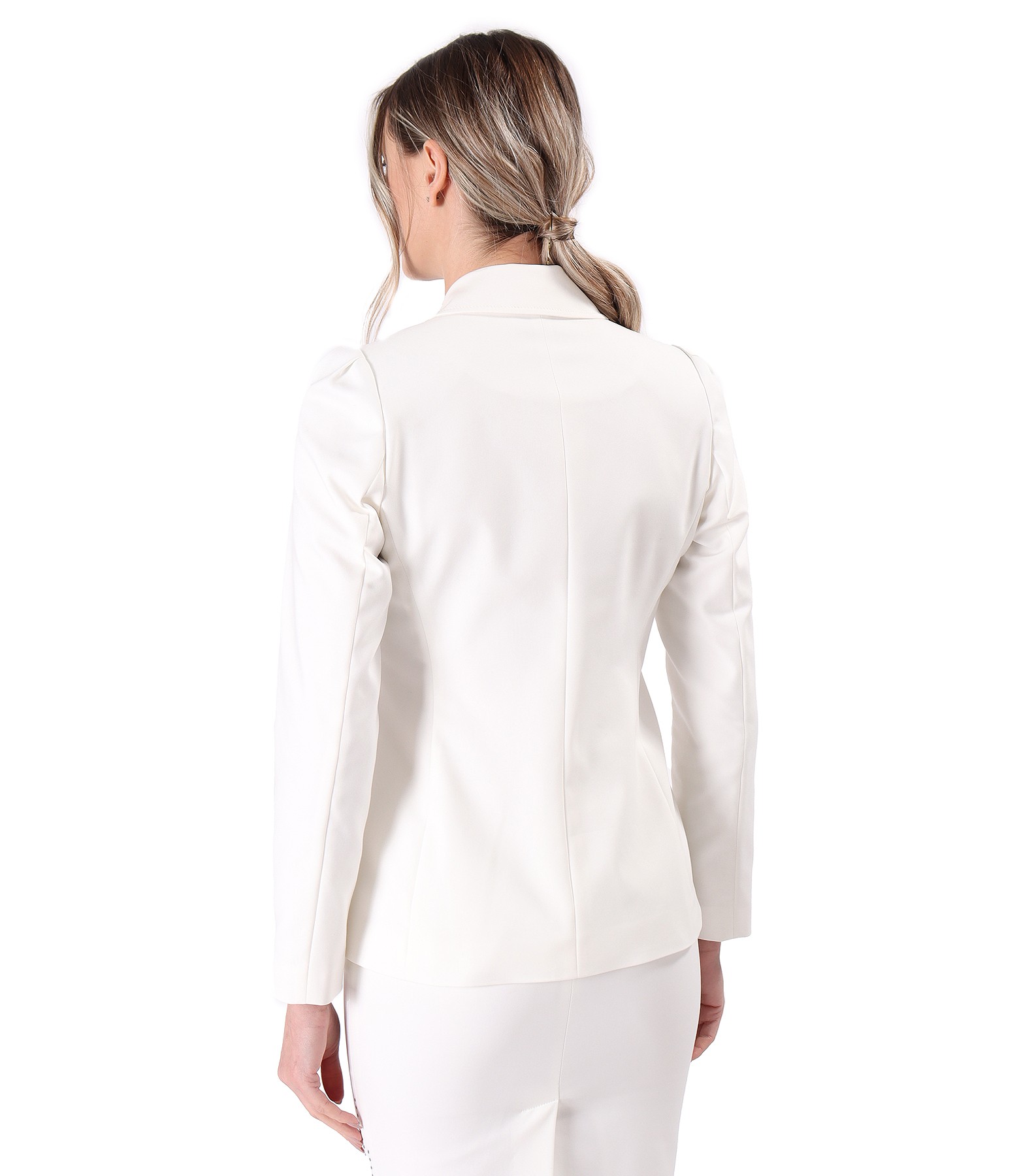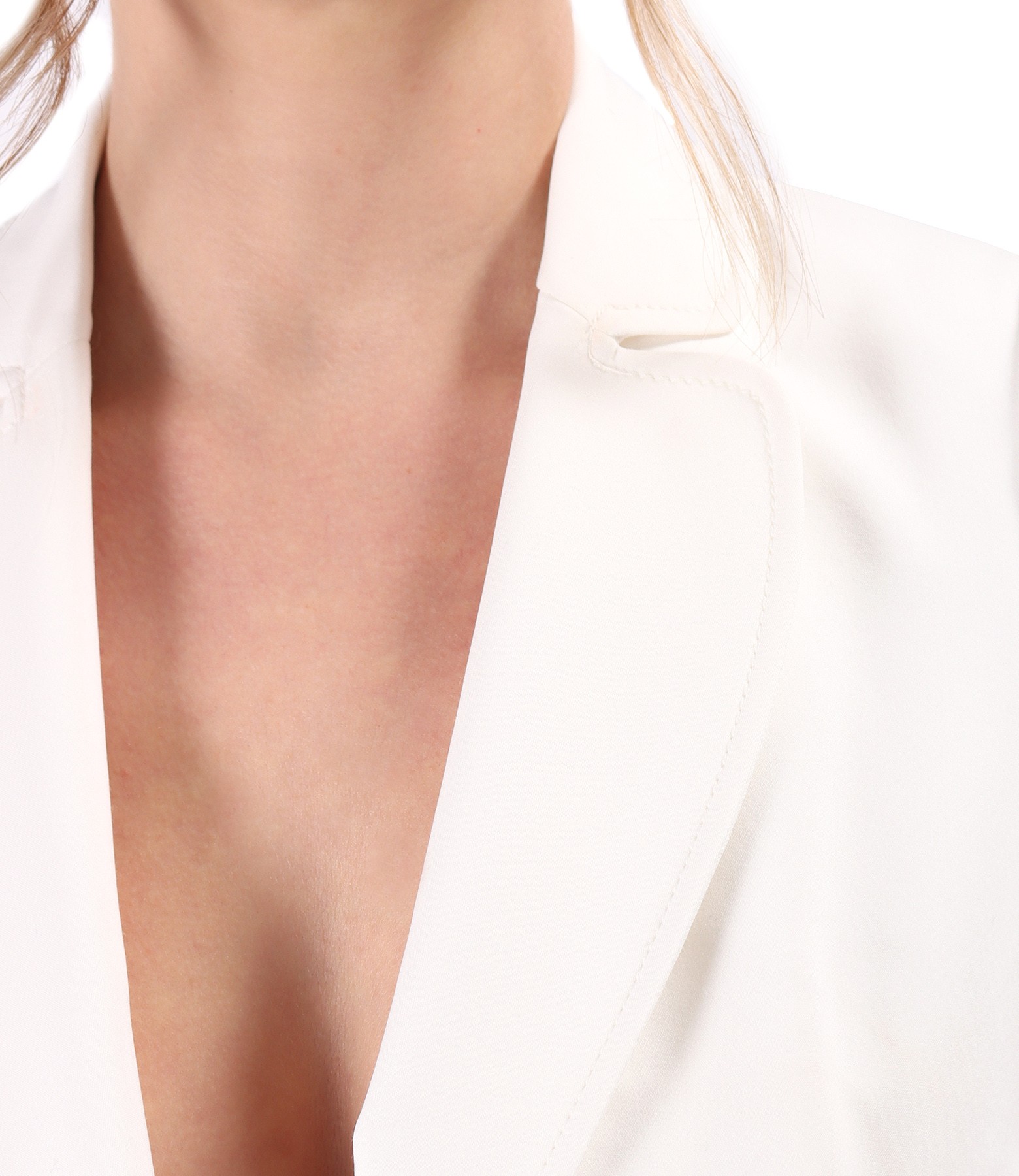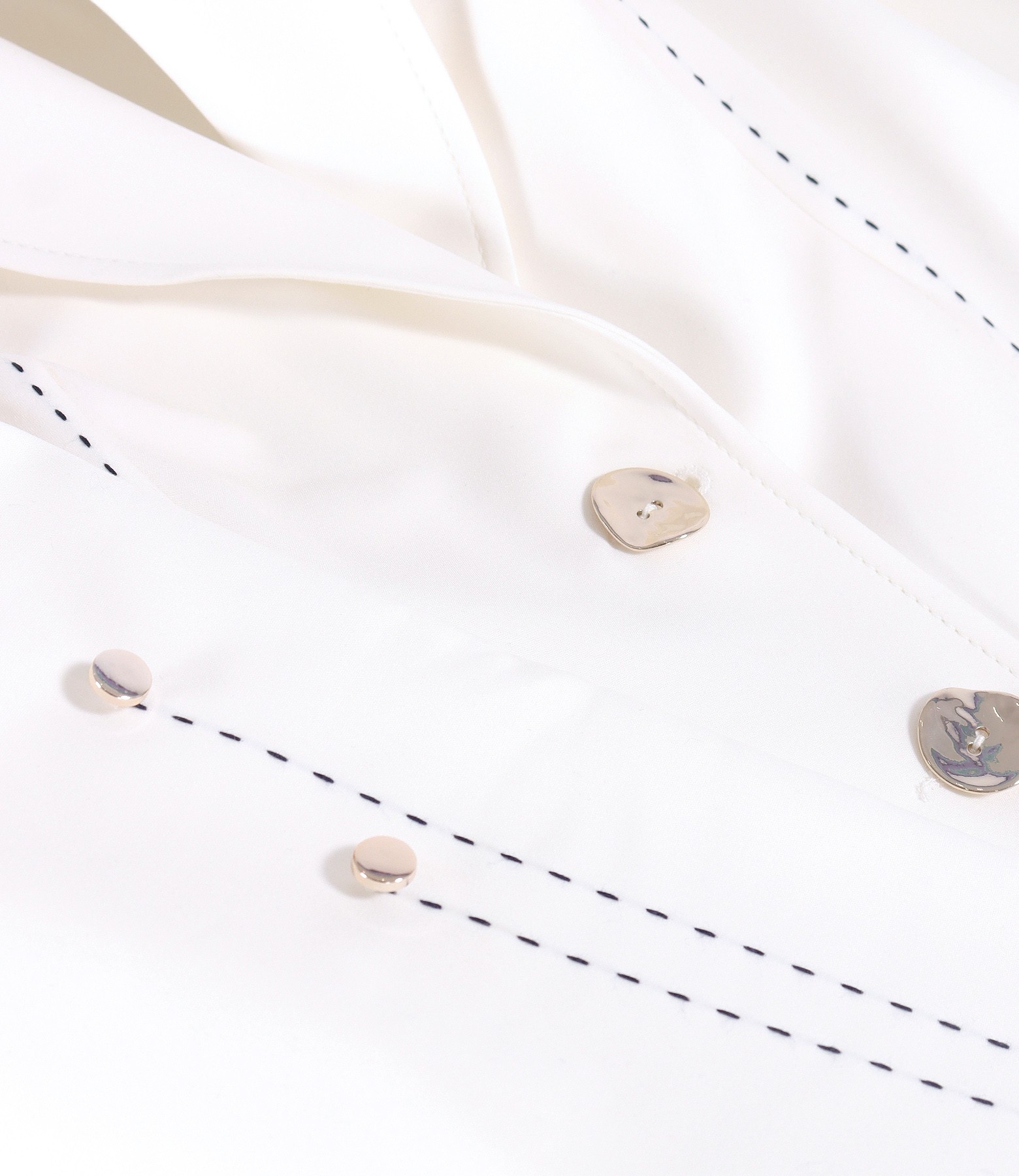 Sacou office din bumbac elastic cu aspect catifelat, captusit, cu decolteu adanc si cu cusatura decorativa in contrast. Se inchide cu doi nasturi aurii pe fata. Pe maneci cusatura decorativa in contrast se termina cu 2 nasturi aurii.