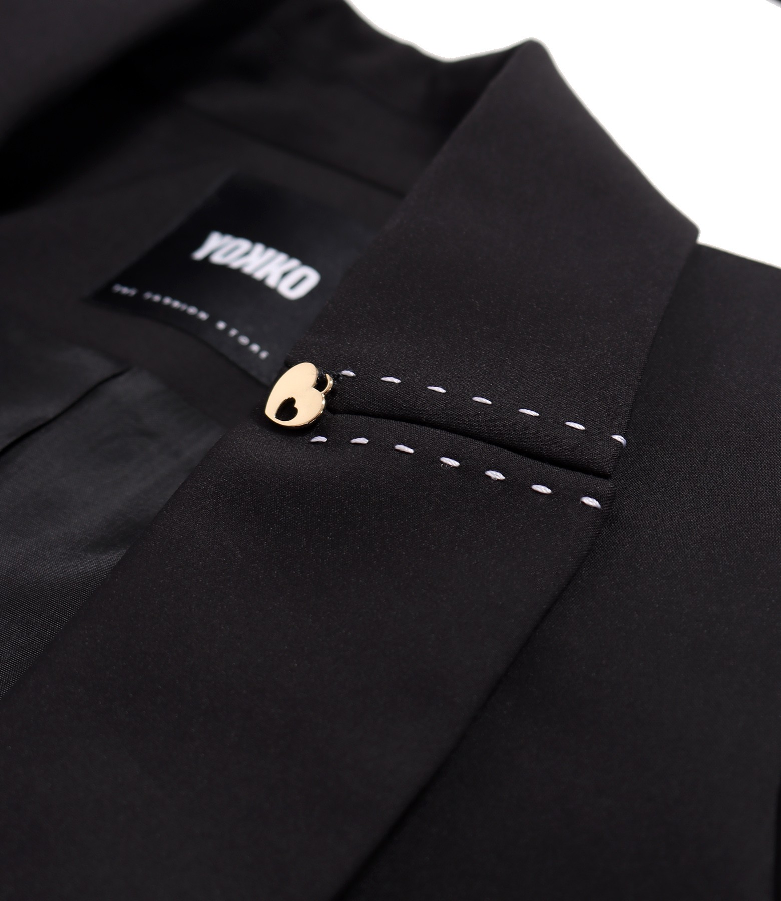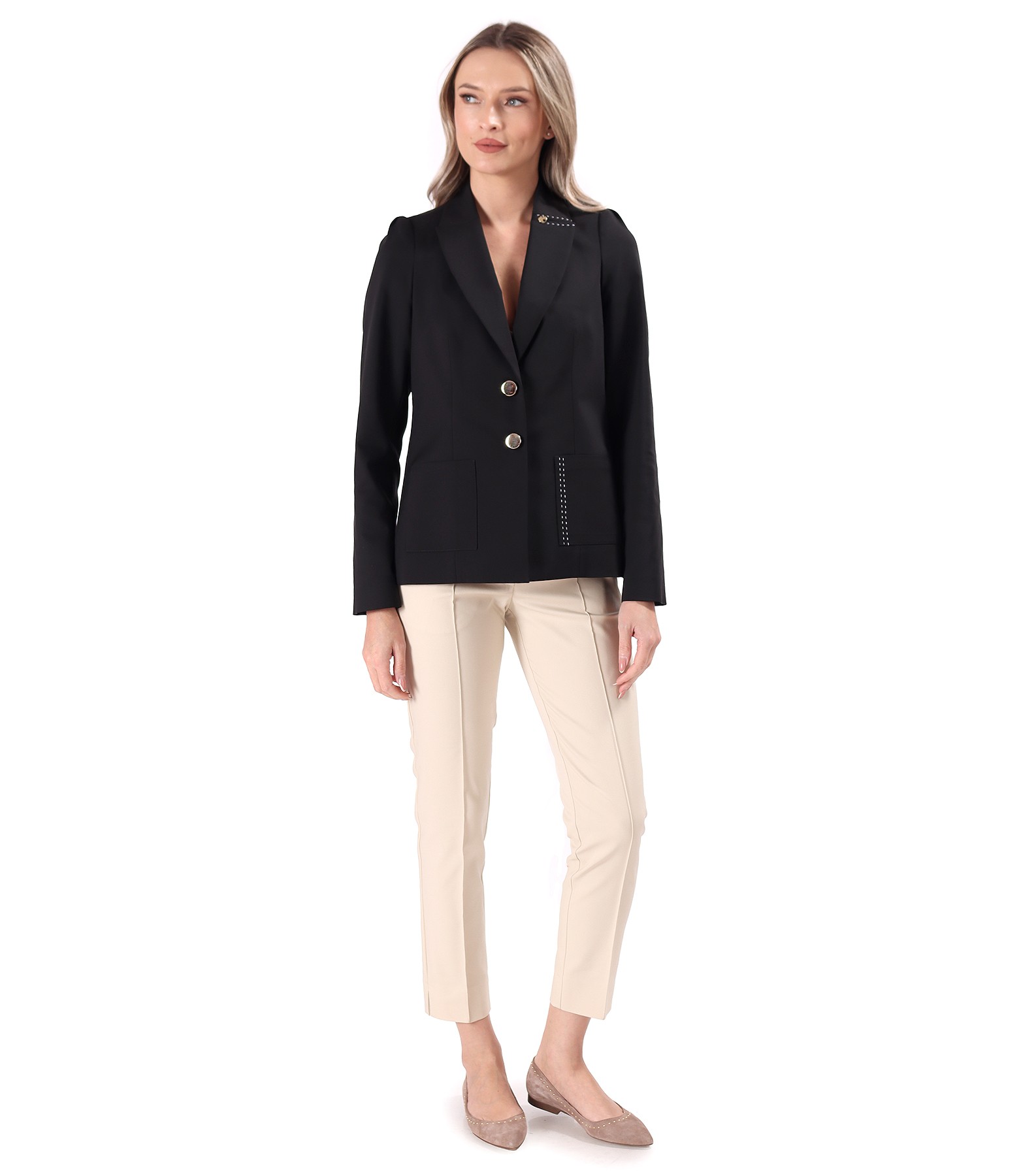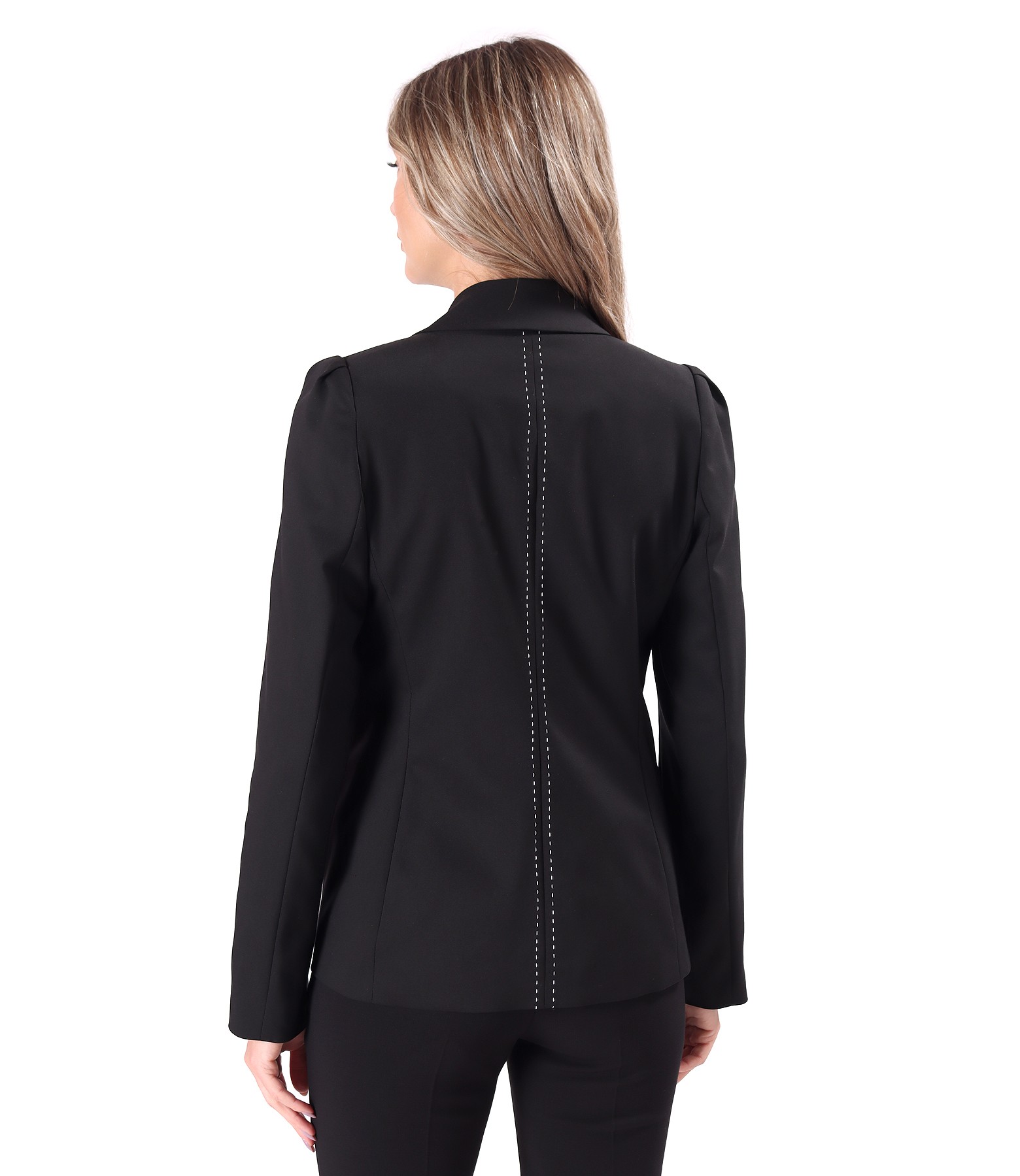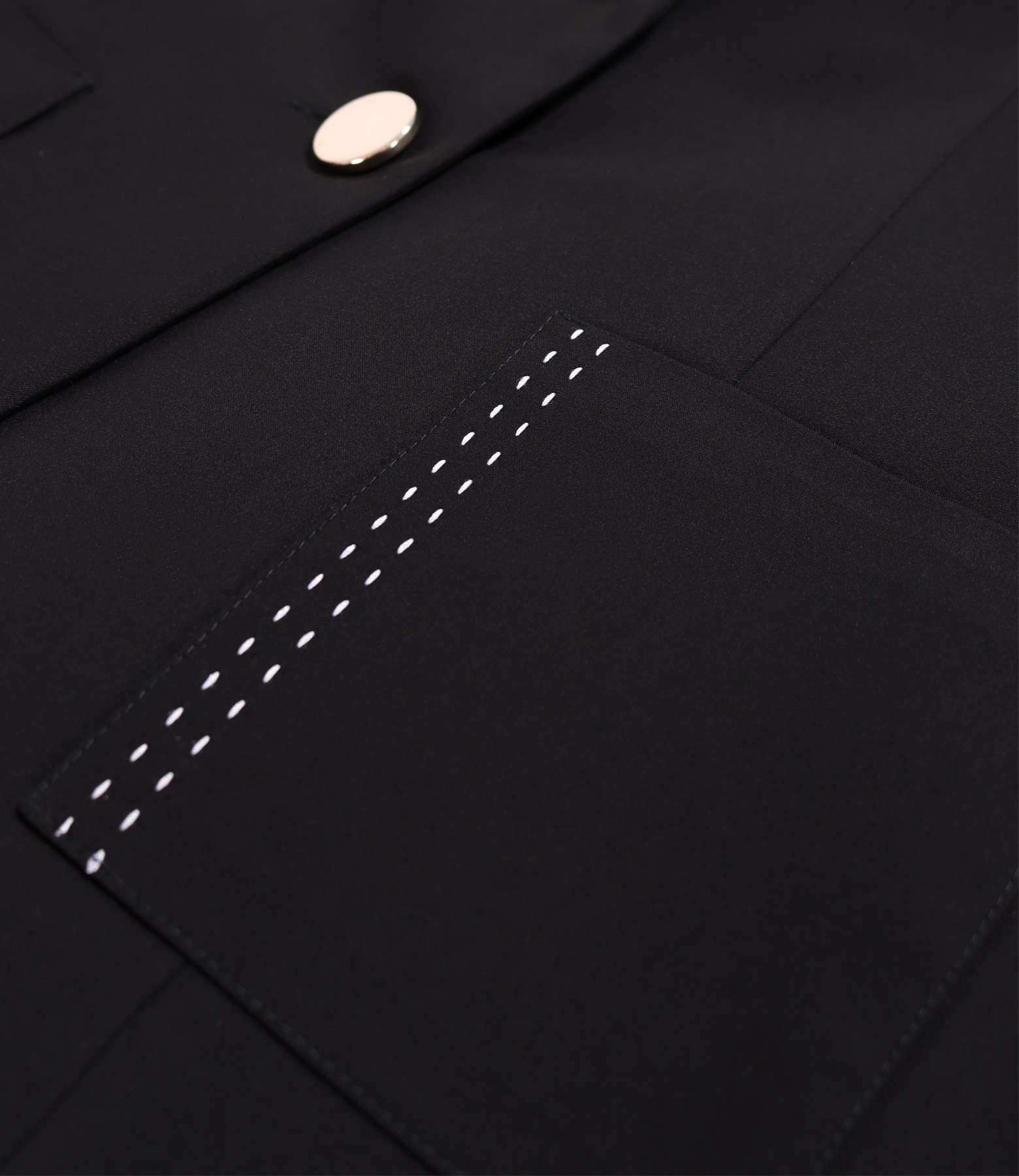 Sacou office din bumbac elastic cu aspect catifelat, captusit, cu decolteu adanc si cu buzunare aplicate pe fata. Are cusatura decorativa in contrast pe buzunar si la rever stanga. Se inchide cu doi nasturi aurii pe fata.