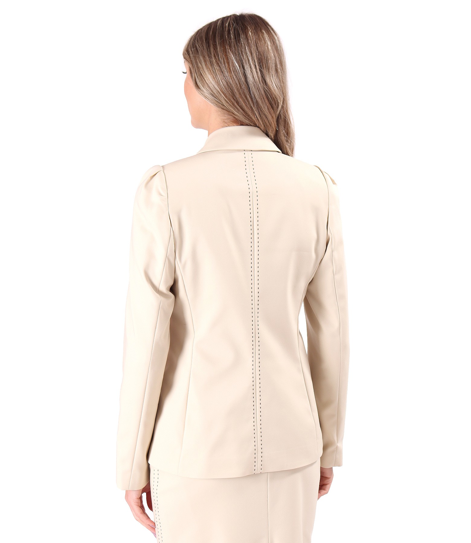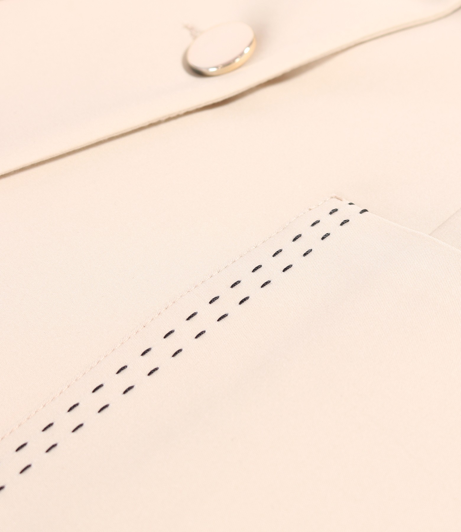 Sacou office din bumbac elastic cu aspect catifelat, captusit, cu decolteu adanc si cu buzunare aplicate pe fata. Are cusatura decorativa in contrast pe buzunar si la rever stanga. Se inchide cu doi nasturi aurii pe fata.