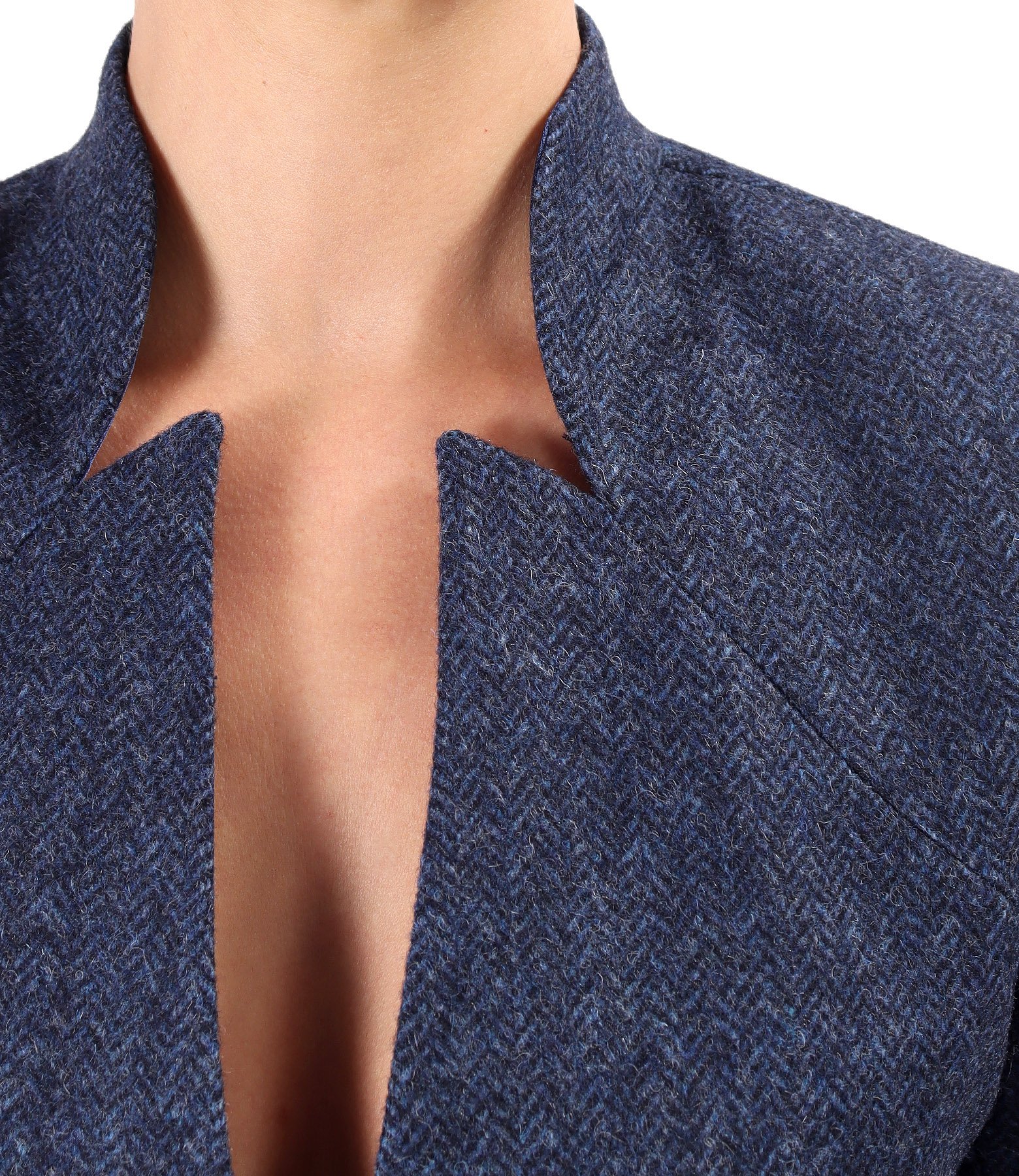 Sacou office din stofa cu lana, dublat cu viscoza, cu guler gen tunica. Se inchide cu un nasture pe mijloc fata.
