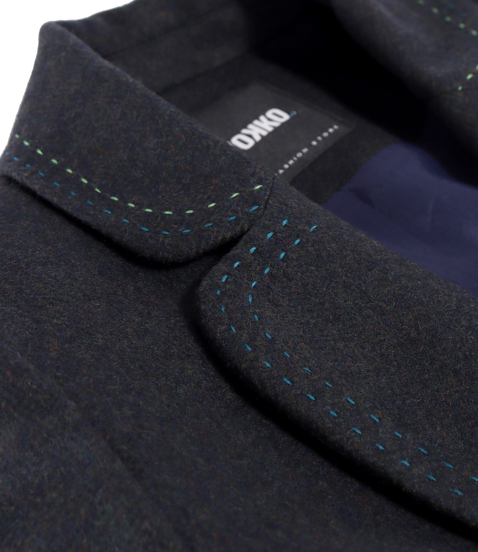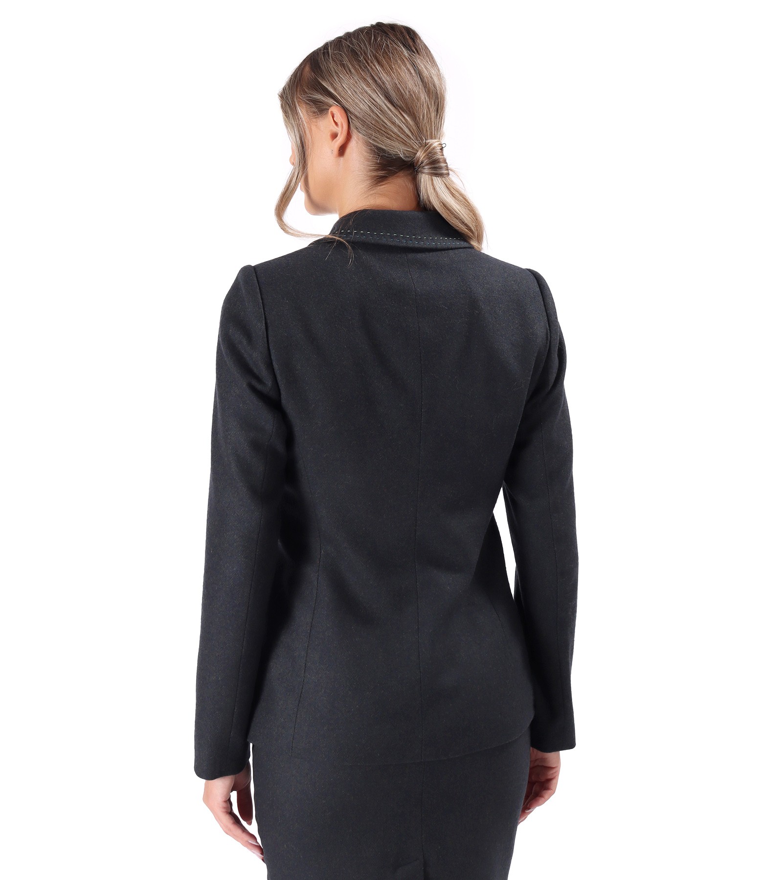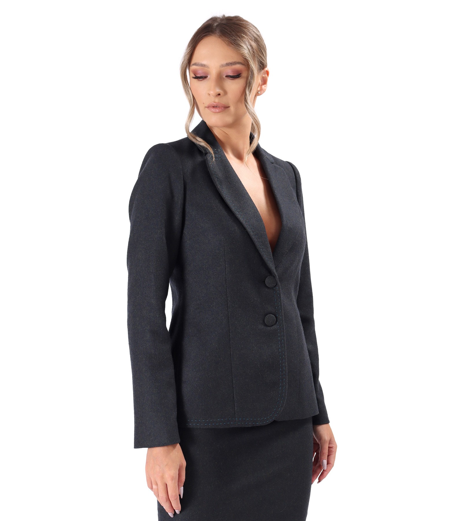 Sacou office din stofa cu lana, captusit, cu decolteu adanc si cu cusatura decorativa in contrast. Se inchide cu doi nasturi pe fata.