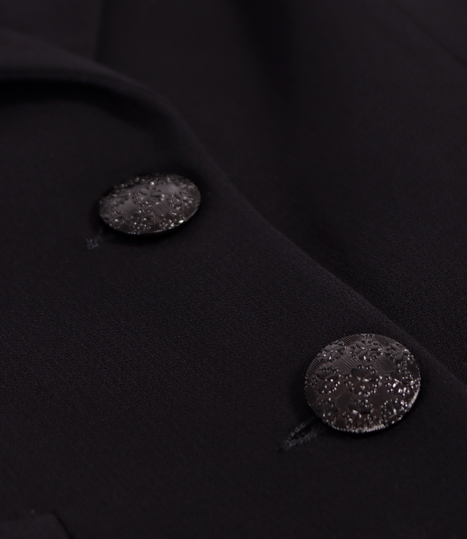 Sacou office din stofa elastica cu viscoza, captusit, cu decolteu adanc si cu buzunare cu rips si lant la refileti. Se inchide cu doi nasturi pe fata.