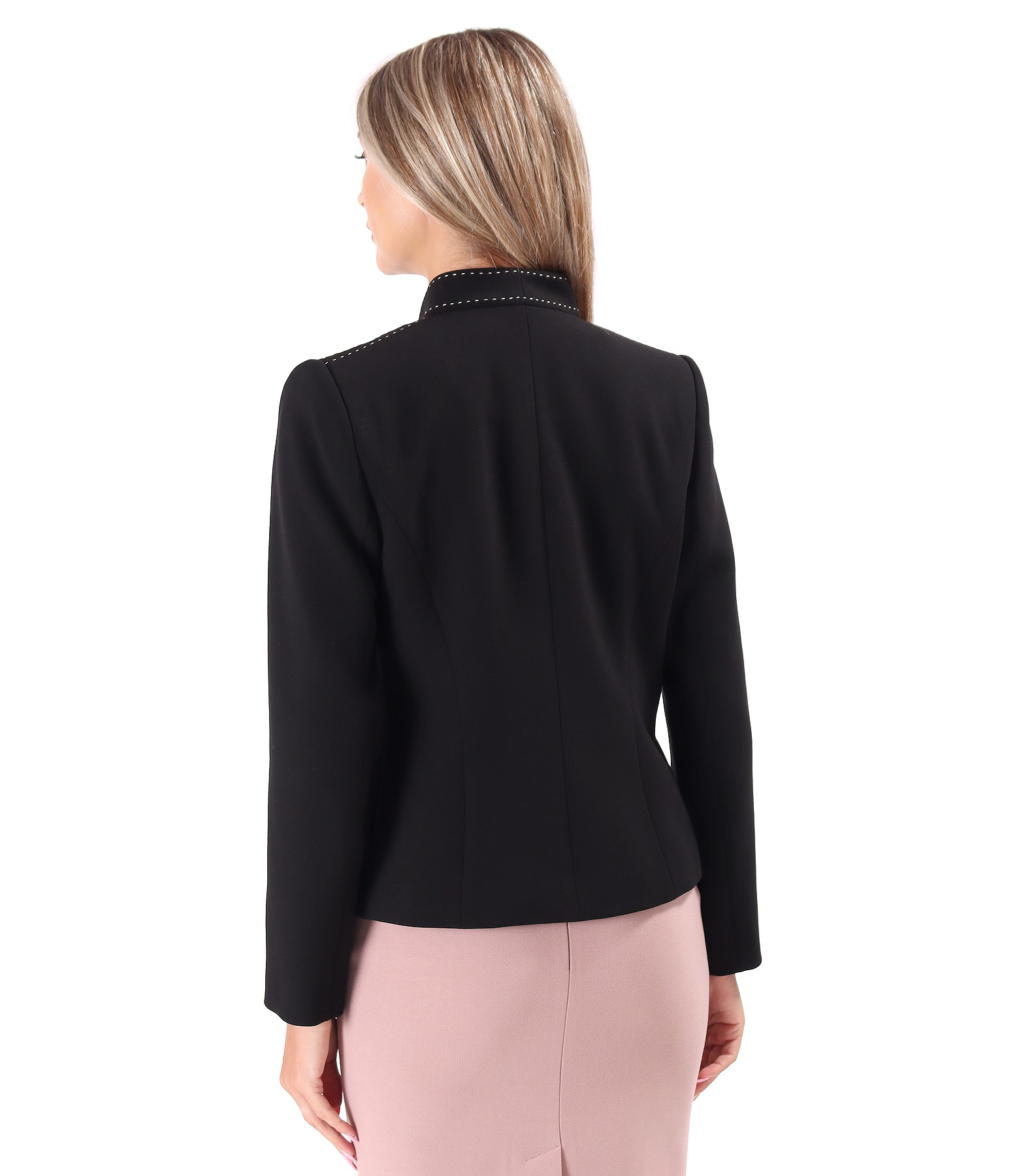 Sacou office din stofa elastica cu viscoza, captusit, cu guler gen tunica cu cusatura decorativa in contrast. Se inchide cu un nasture pe mijloc fata.