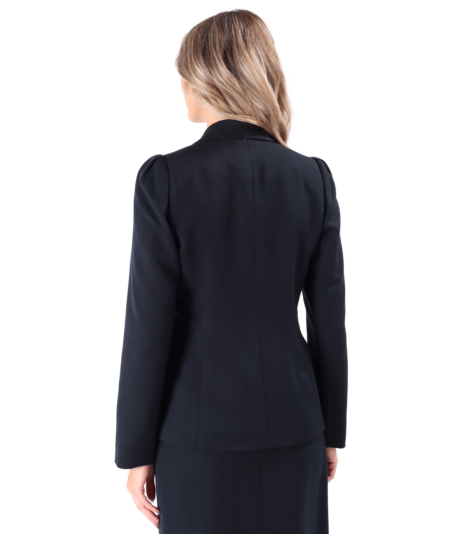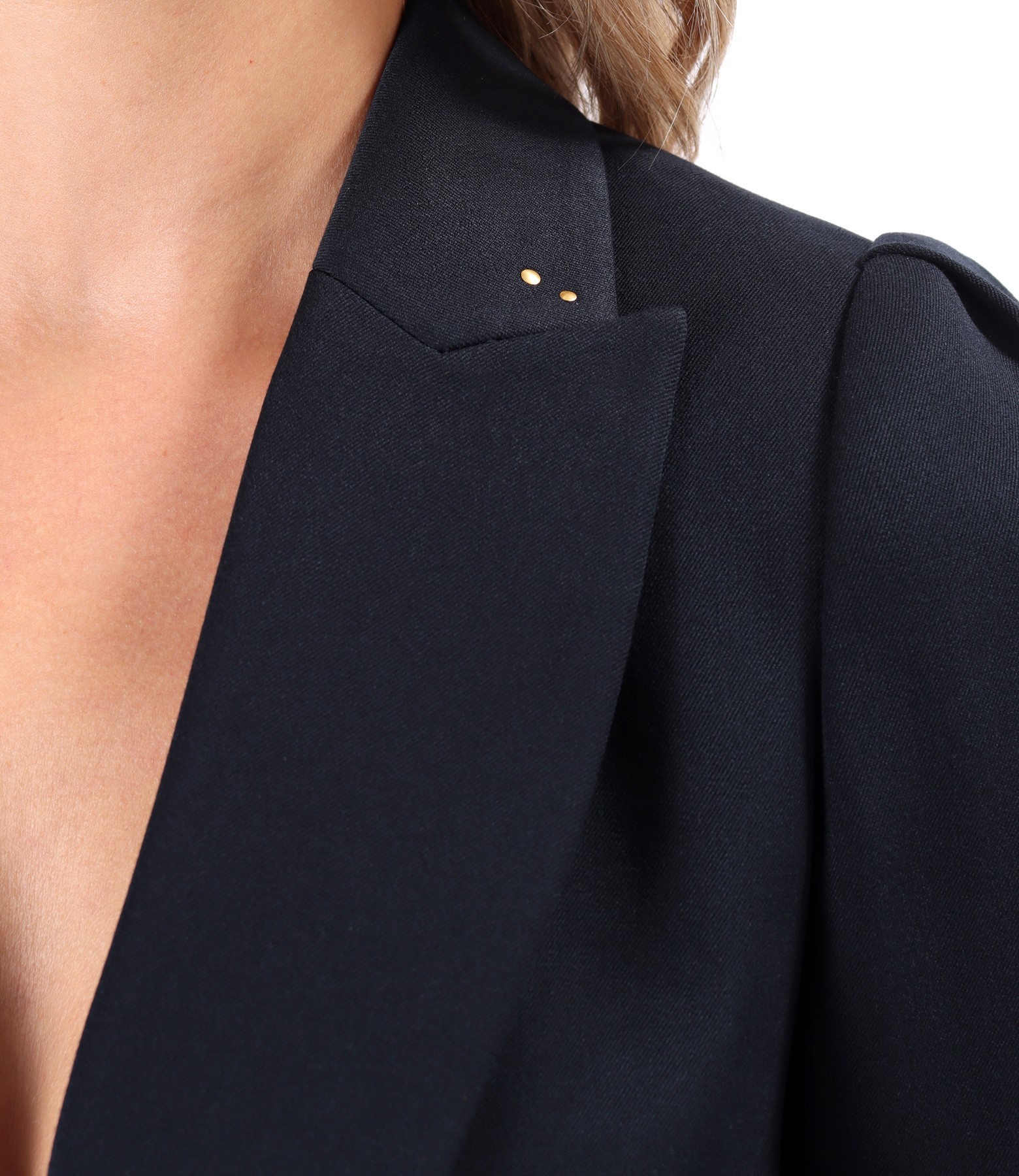 Sacou office din stofa elastica cu viscoza, captusit, cu decolteu adanc si buzunare laterale pe fata. Se inchide cu un nasture pe fata.