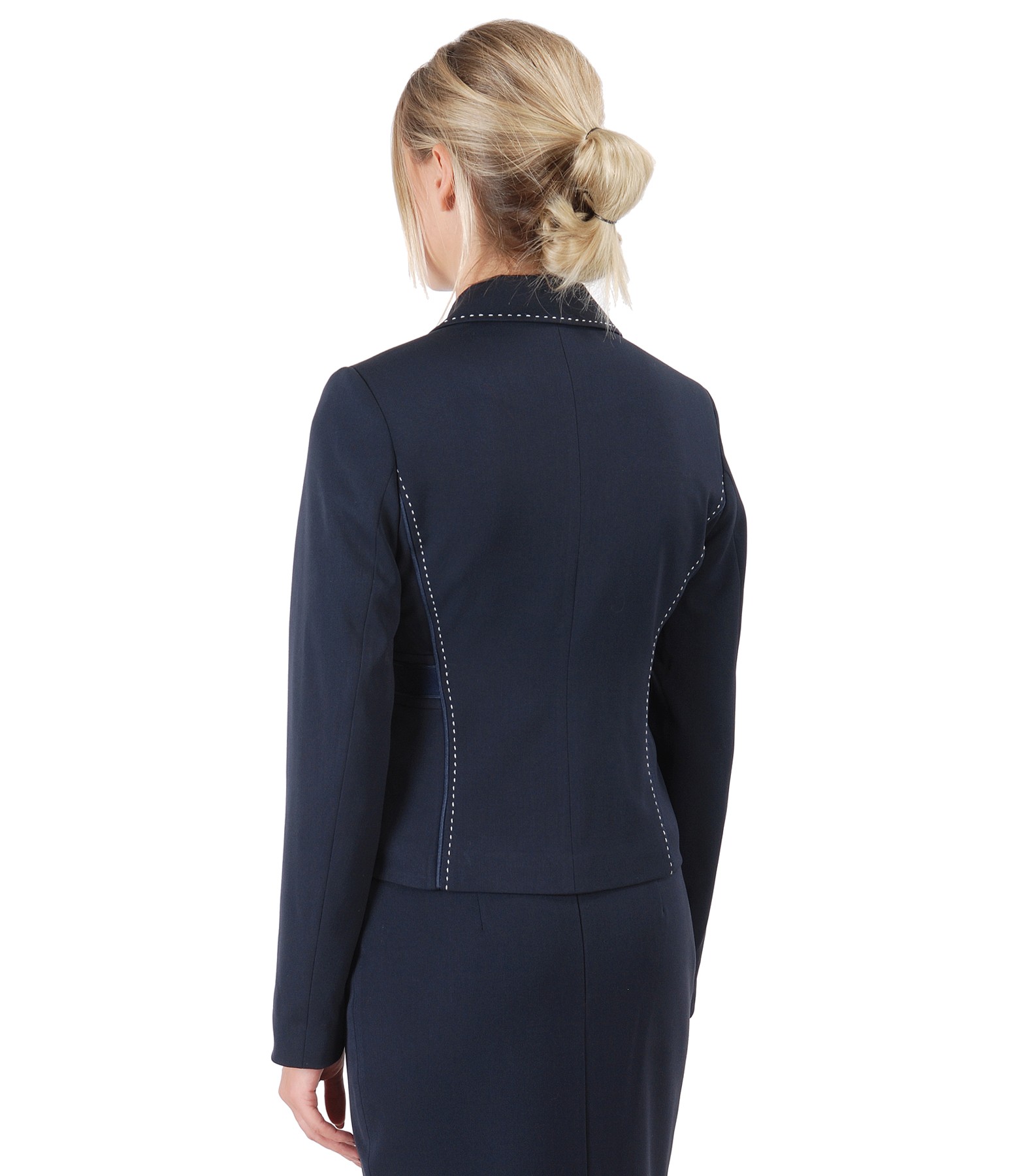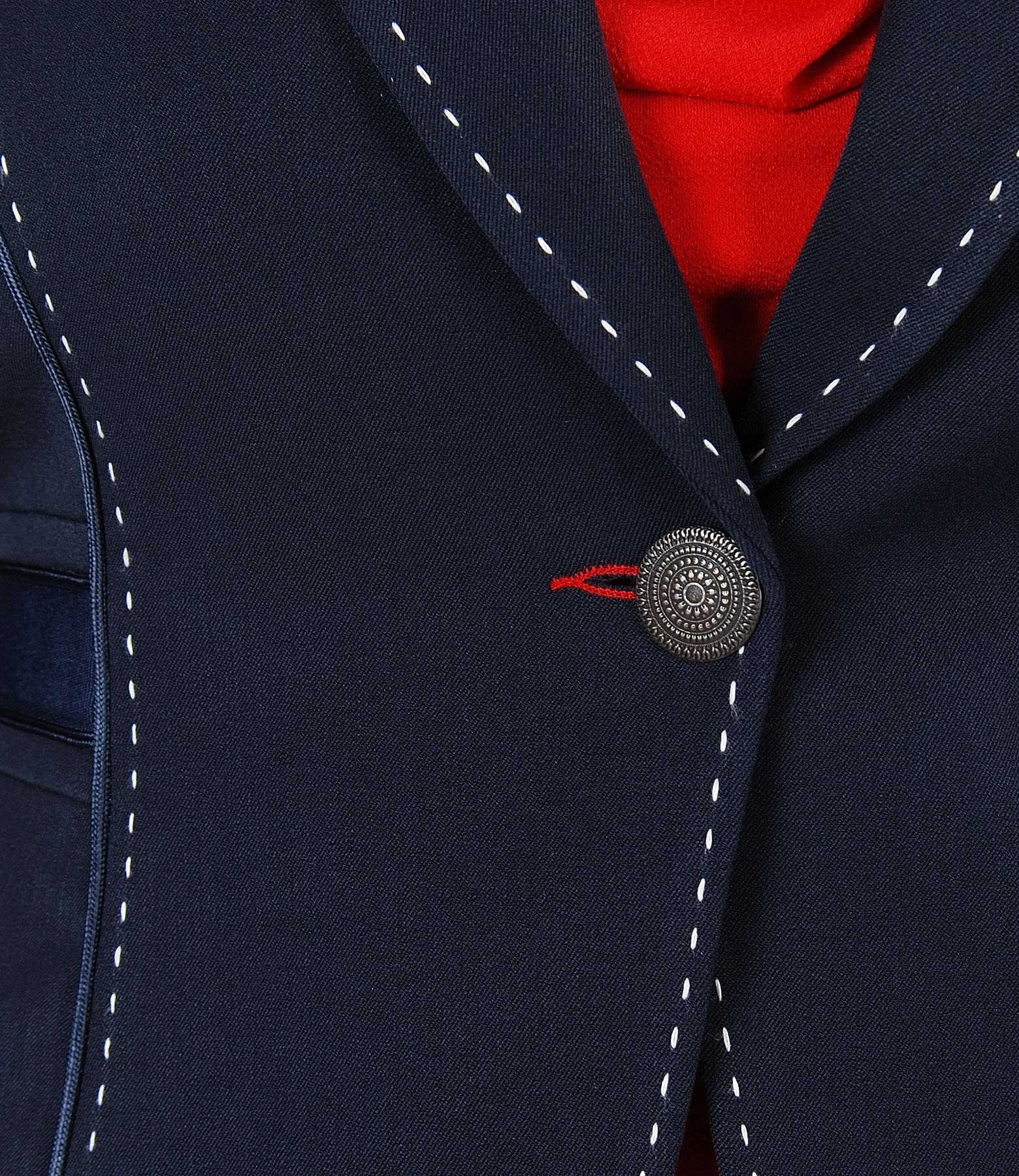 Sacou office din stofa elastica cu viscoza, captusit, cu decolteu adanc, banda de rips aplicata pe laterale si tighel de contrast pe fata si pe spate. Se inchide cu un nasture pe fata.