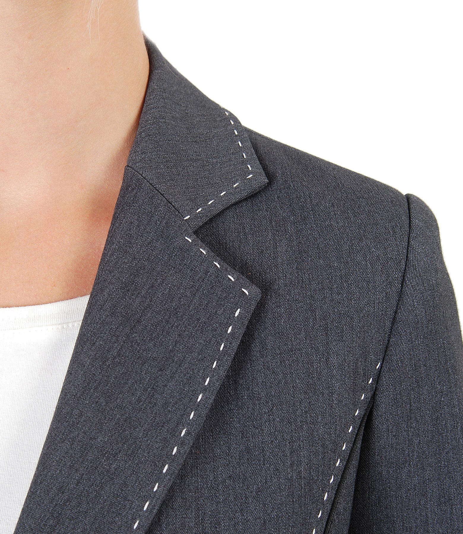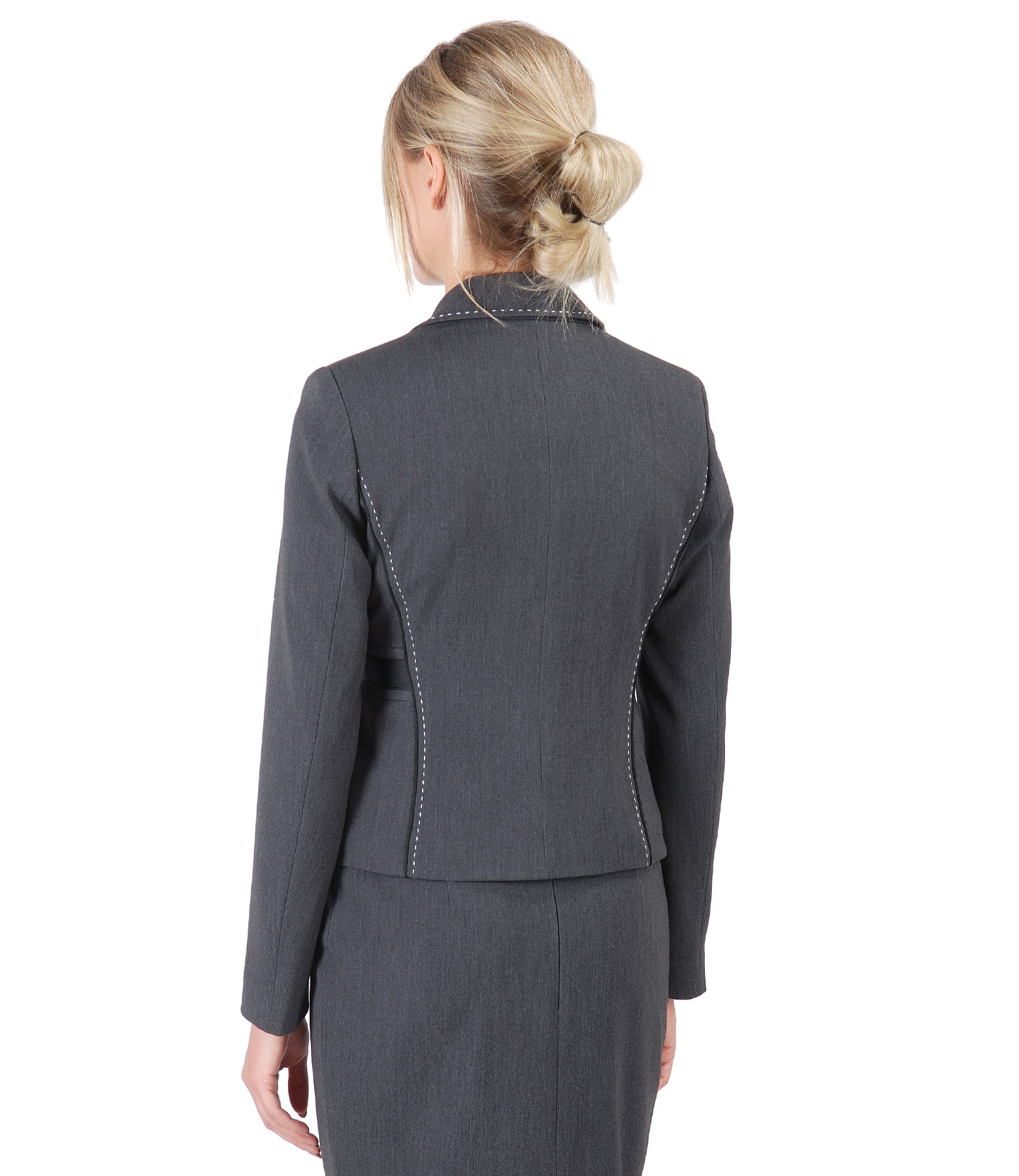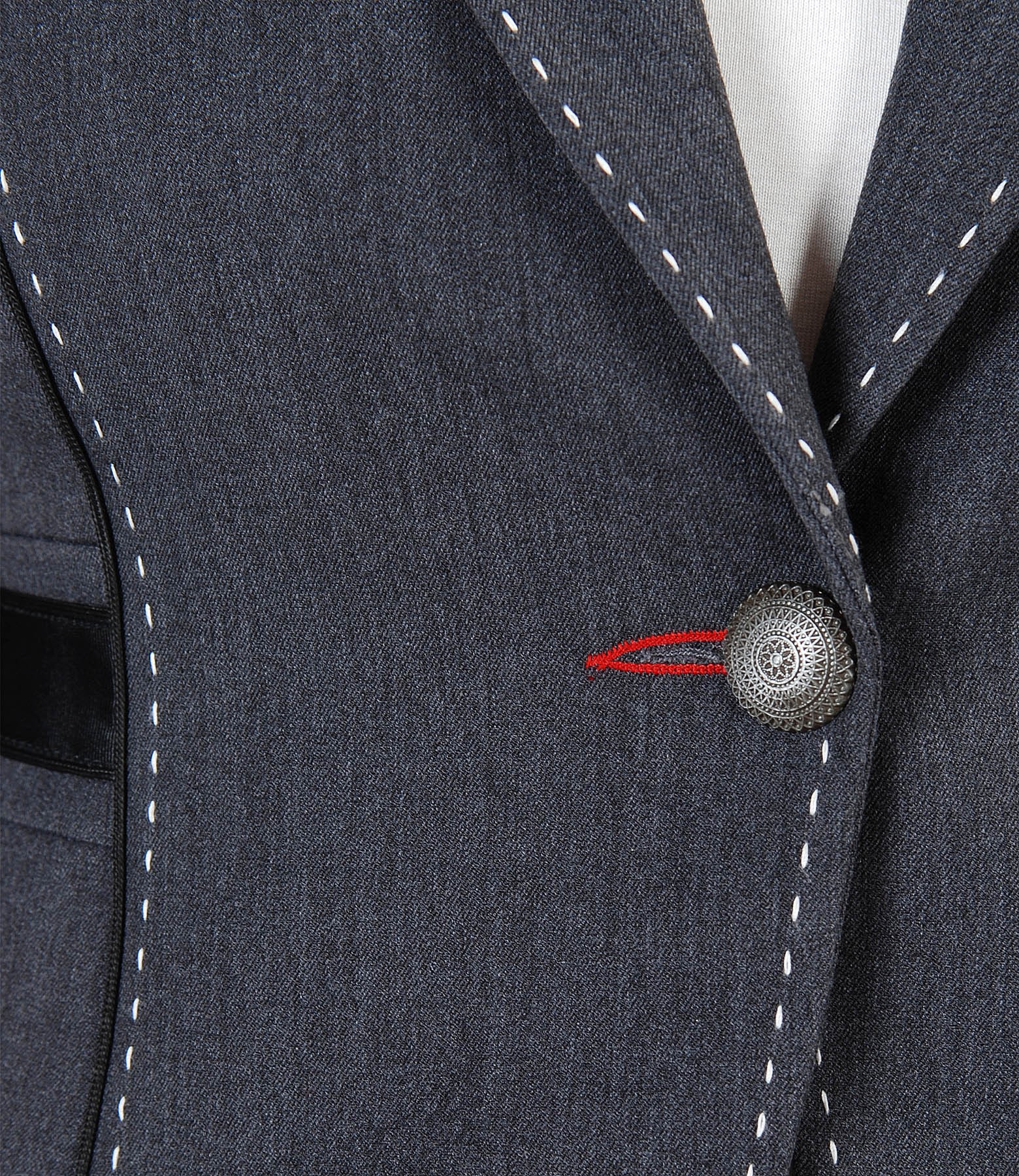 Sacou office din stofa elastica cu viscoza, captusit, cu decolteu adanc, banda de rips aplicata pe laterale si tighel de contrast pe fata si pe spate. Se inchide cu un nasture pe fata.