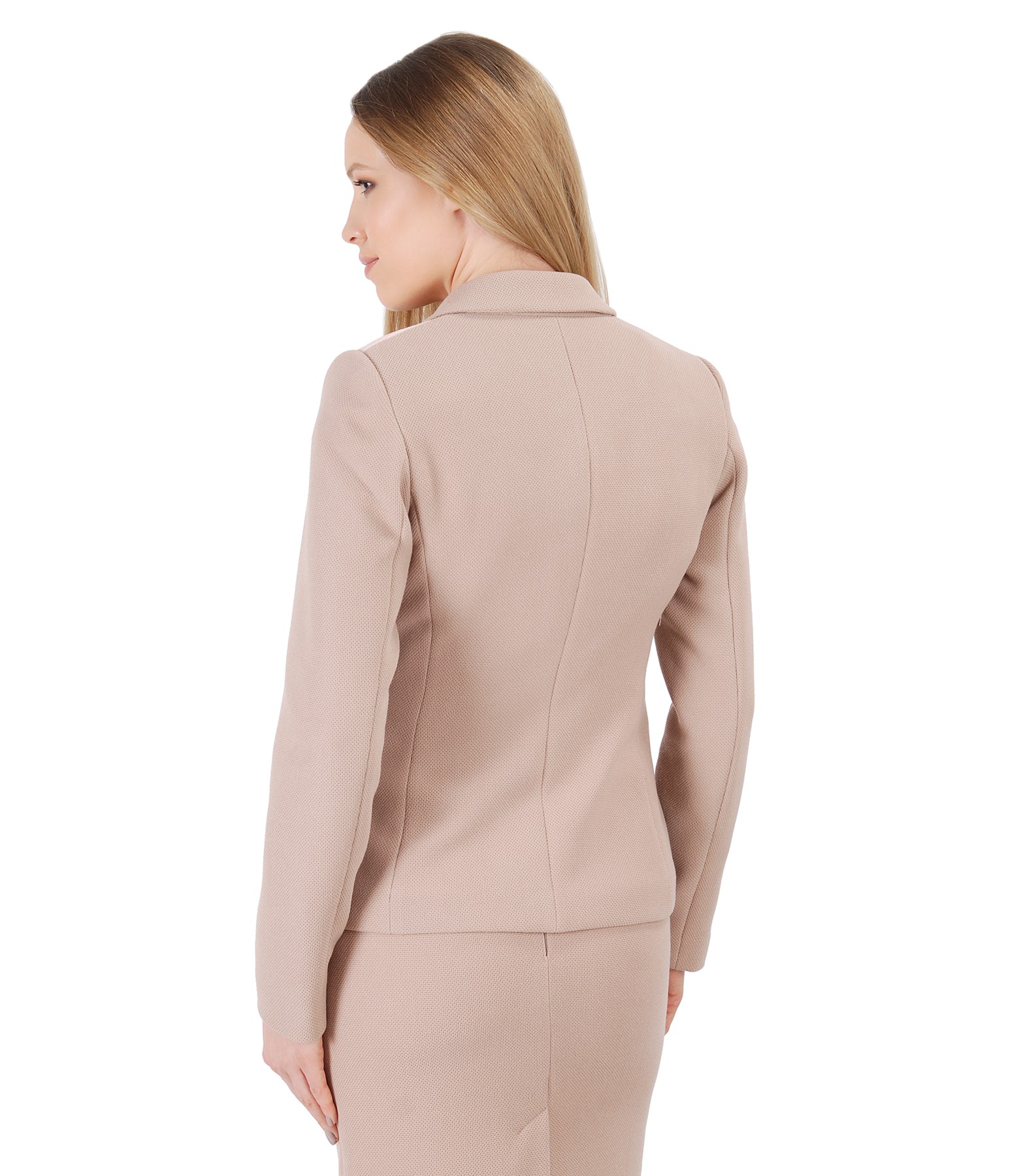 Sacou office din stofa elastica texturata, cu decolteu adanc, buzunare in talie si aplicatie din piele pe umar. Se inchide cu un nasture pe fata.