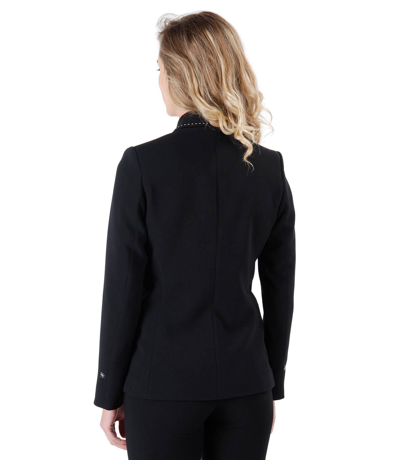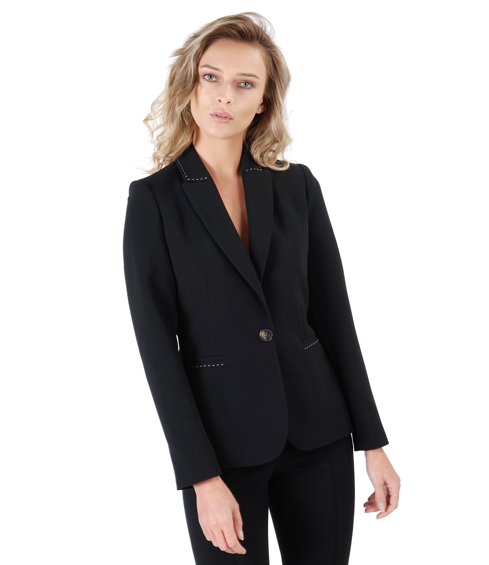 Sacou office din stofa elastica, captusit, cu decolteu adanc, buzunare laterale pe fata si cusatura decorativa la buzunare si pe guler. Se inchide cu un nasture pe fata.