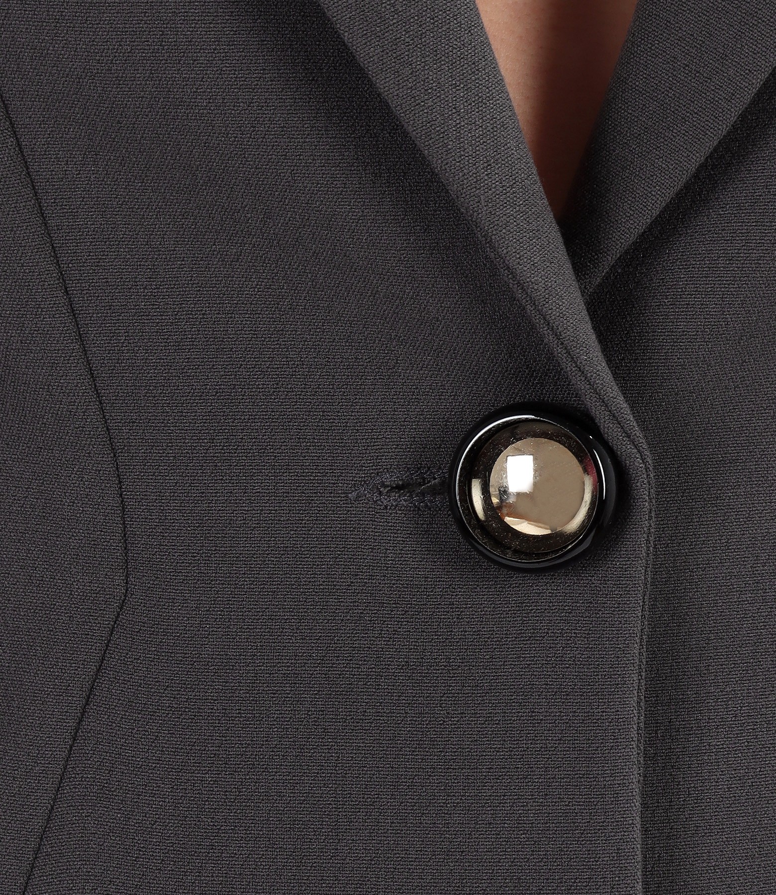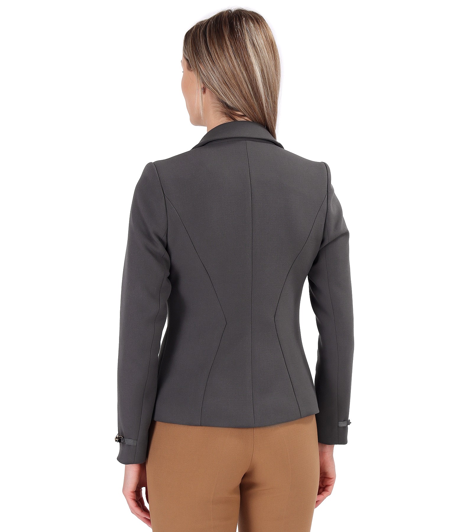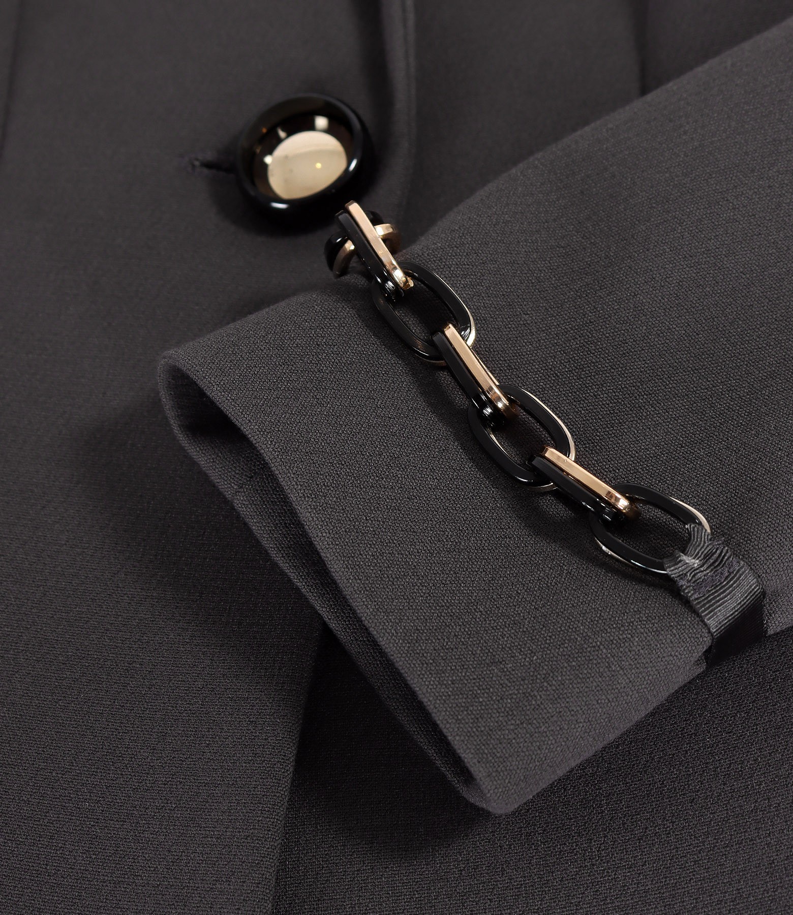 Sacou office din stofa plina elastica, captusit, cu decolteu adanc si cu lant decorativ la terminatia manecilor. Se inchide cu un nasture pe fata.