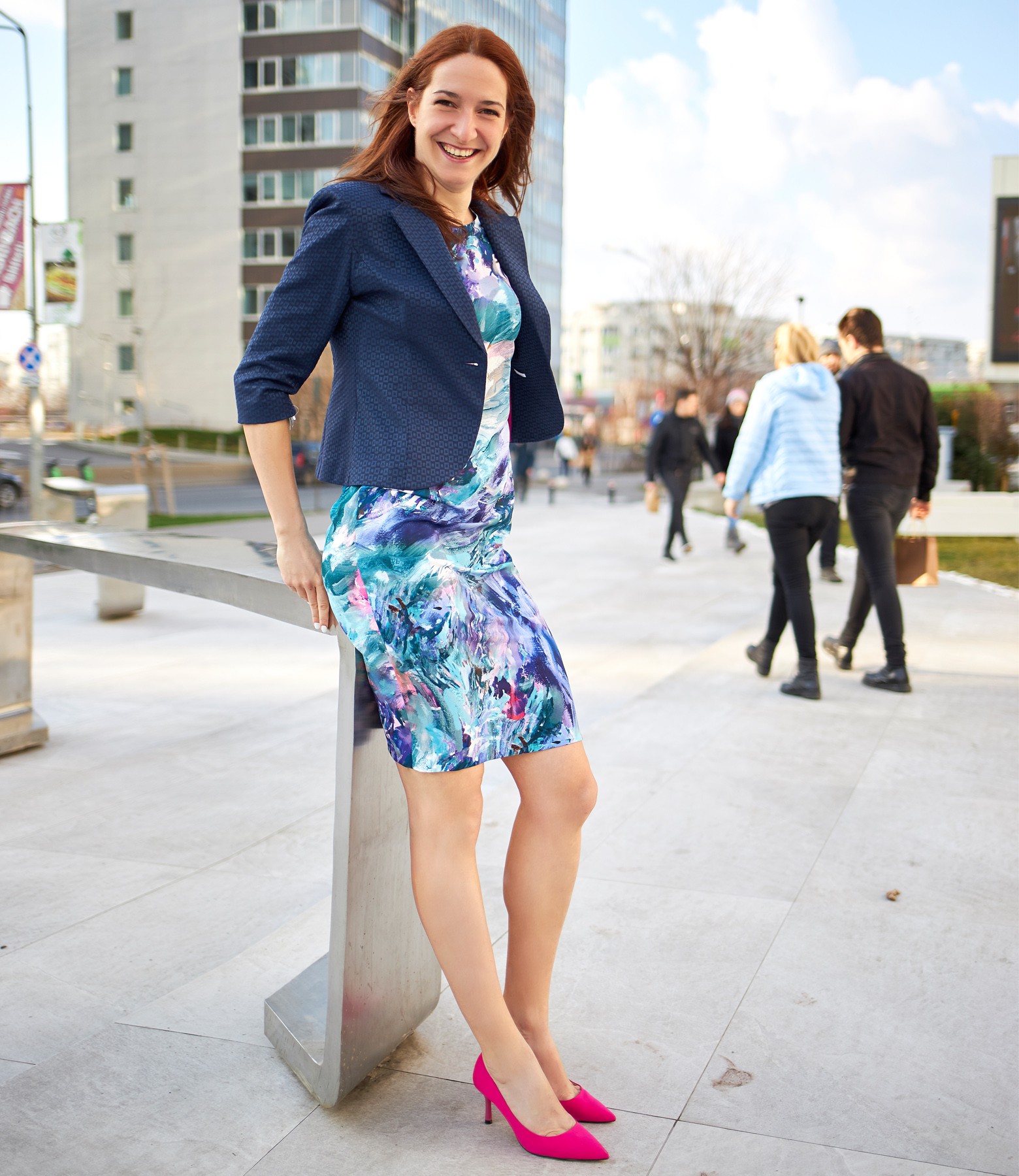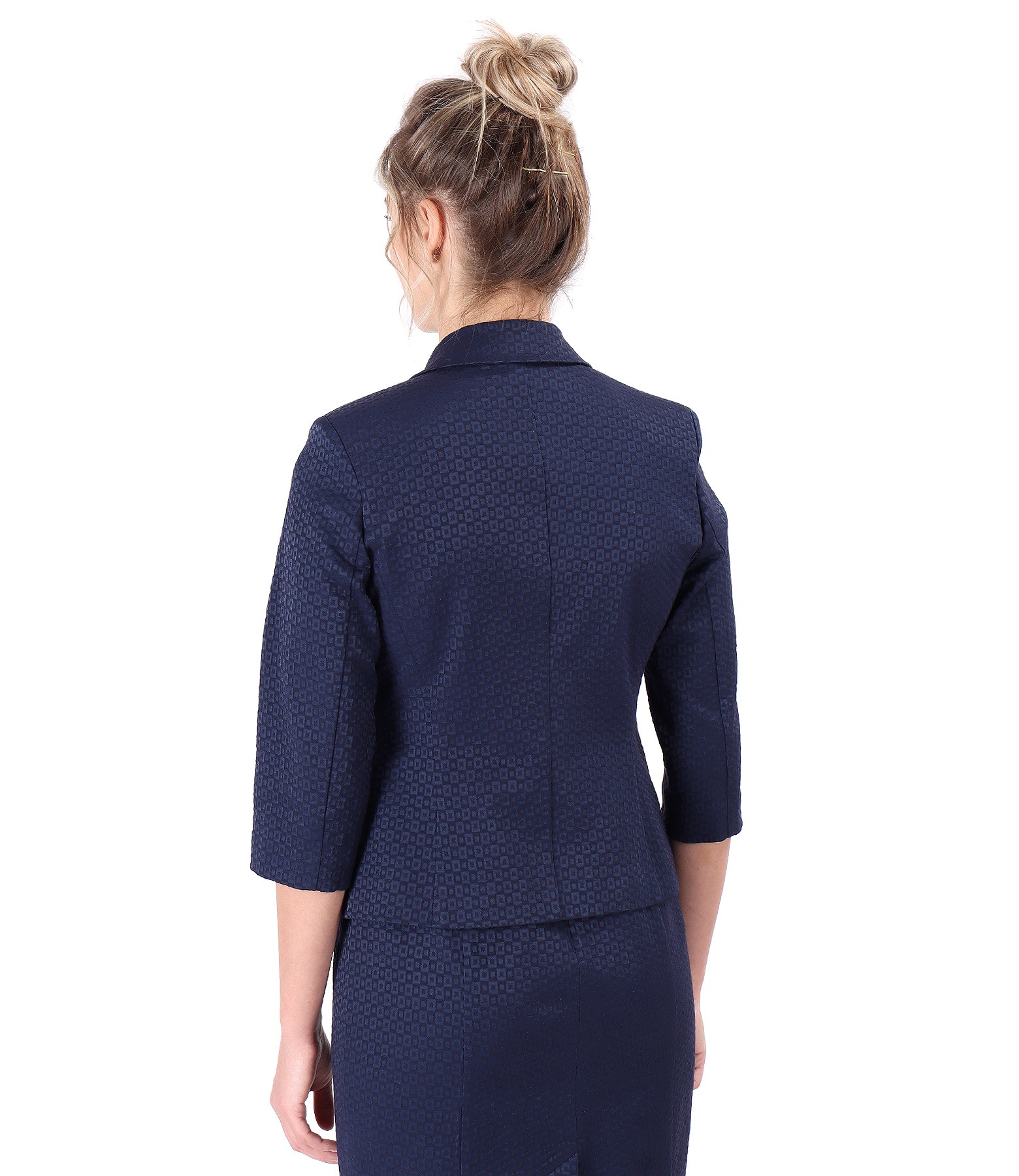 Sacou office, din bumbac elastic texturat, necaptusit, cambrat si cu maneci 3/4 si cu pin decorativ la decolteu. Se inchide cu un nasture pe fata.