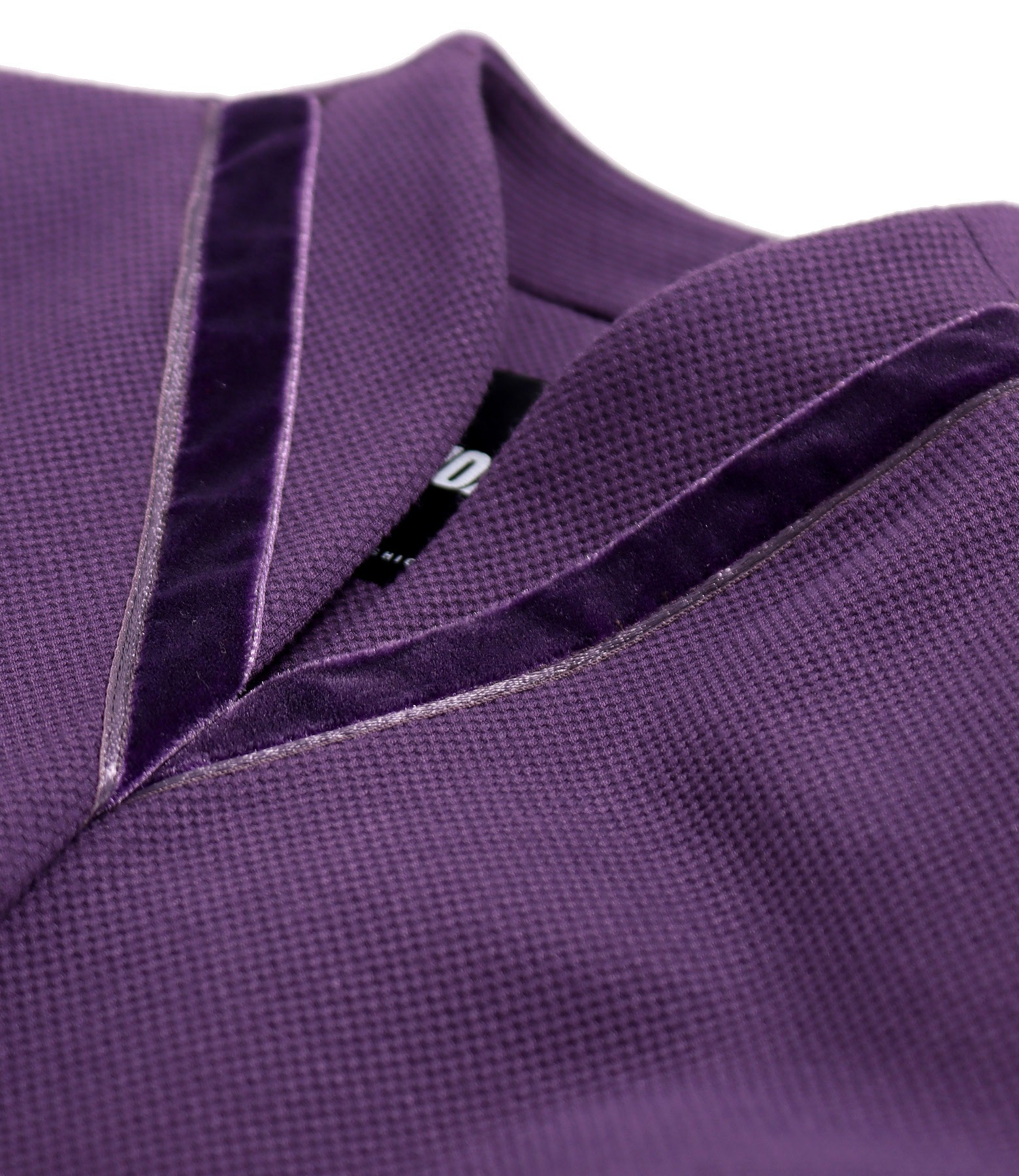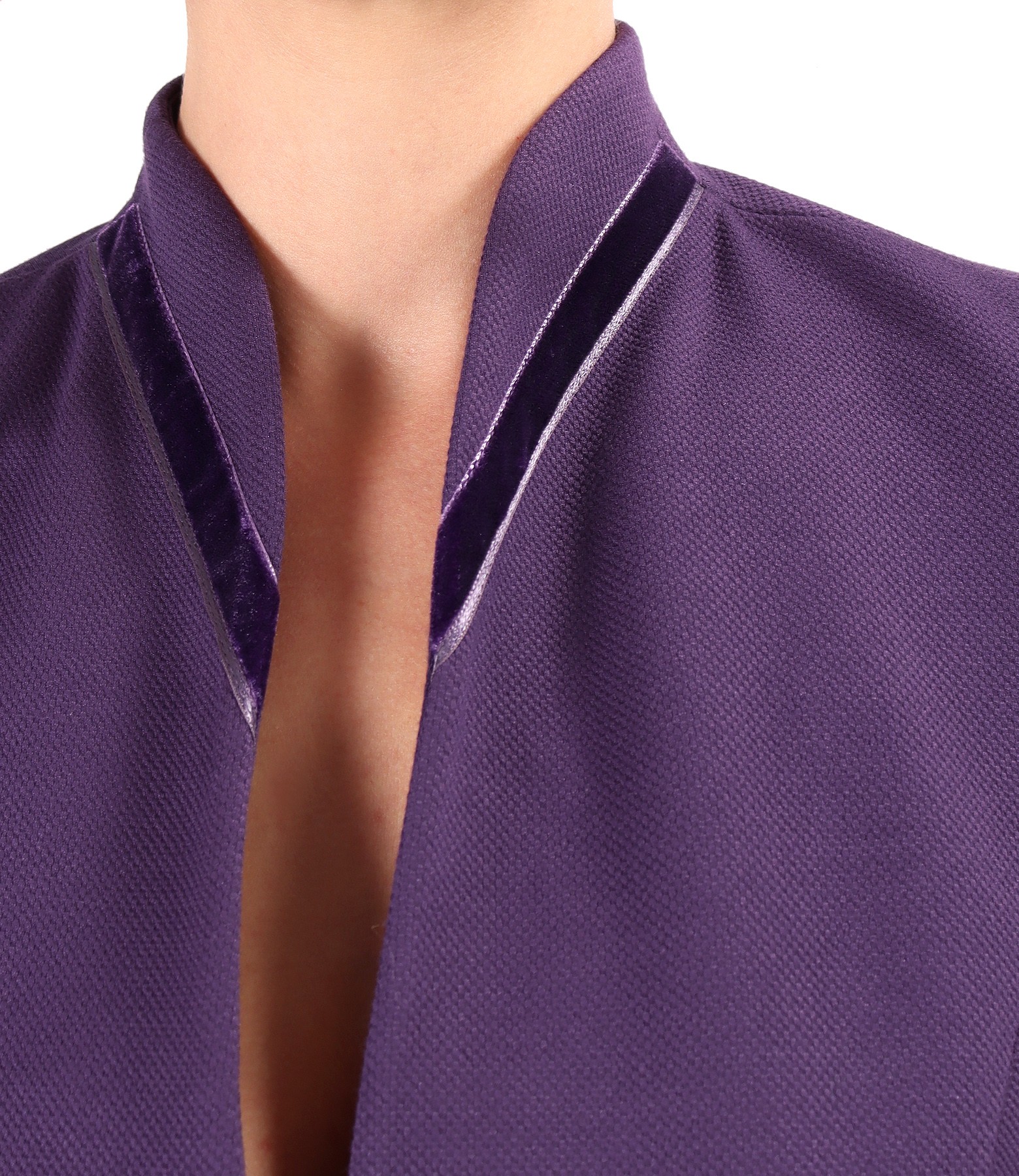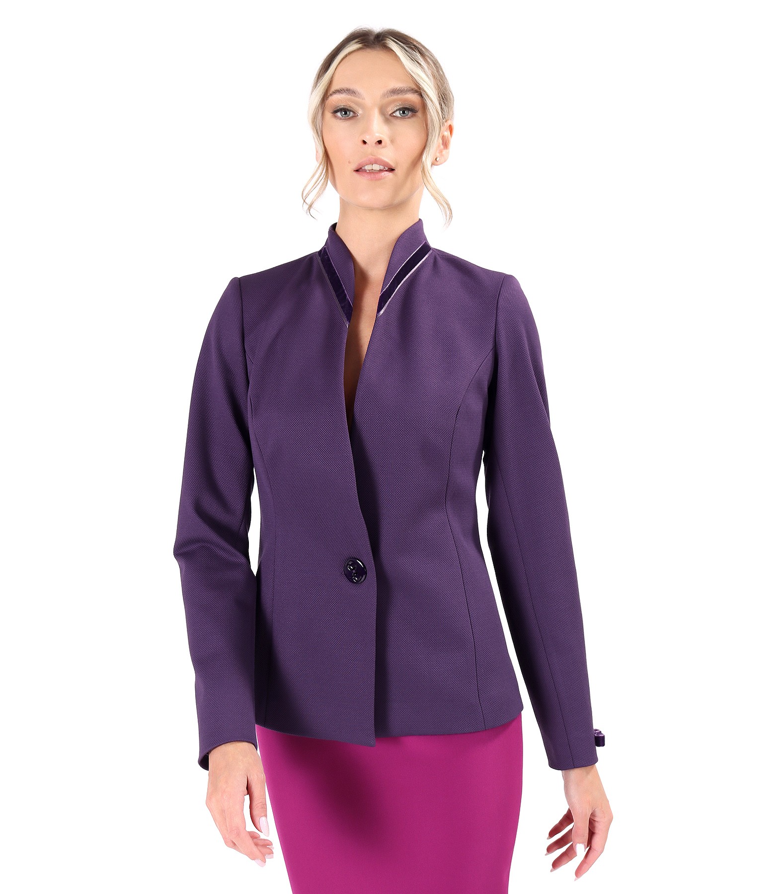 Sacou office din stofa texturata cu viscoza, captusit, cu guler gen tunica, decolteu adanc si garnituri din catifea. Se inchide cu un nasture pe mijloc fata.