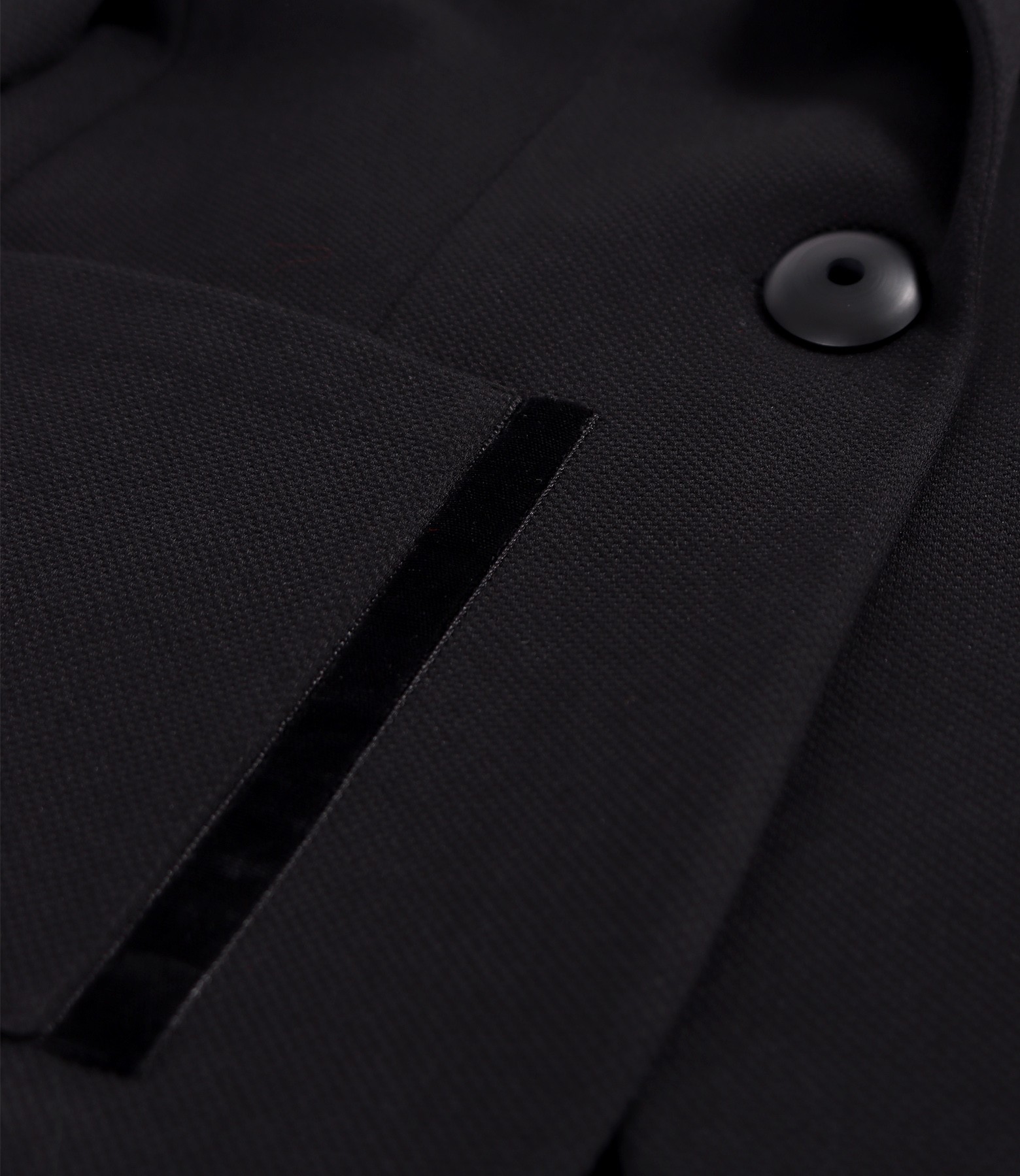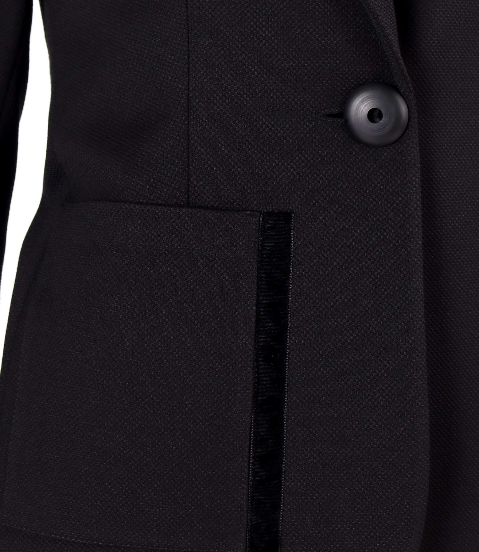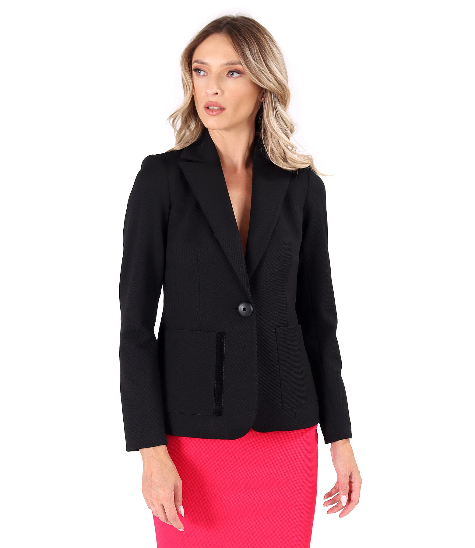 Sacou office din stofa texturata cu viscoza, captusit, cu decolteu adanc si cu buzunare aplicate pe fata si garnitura din catifea. Se inchide cu un nasture pe fata.