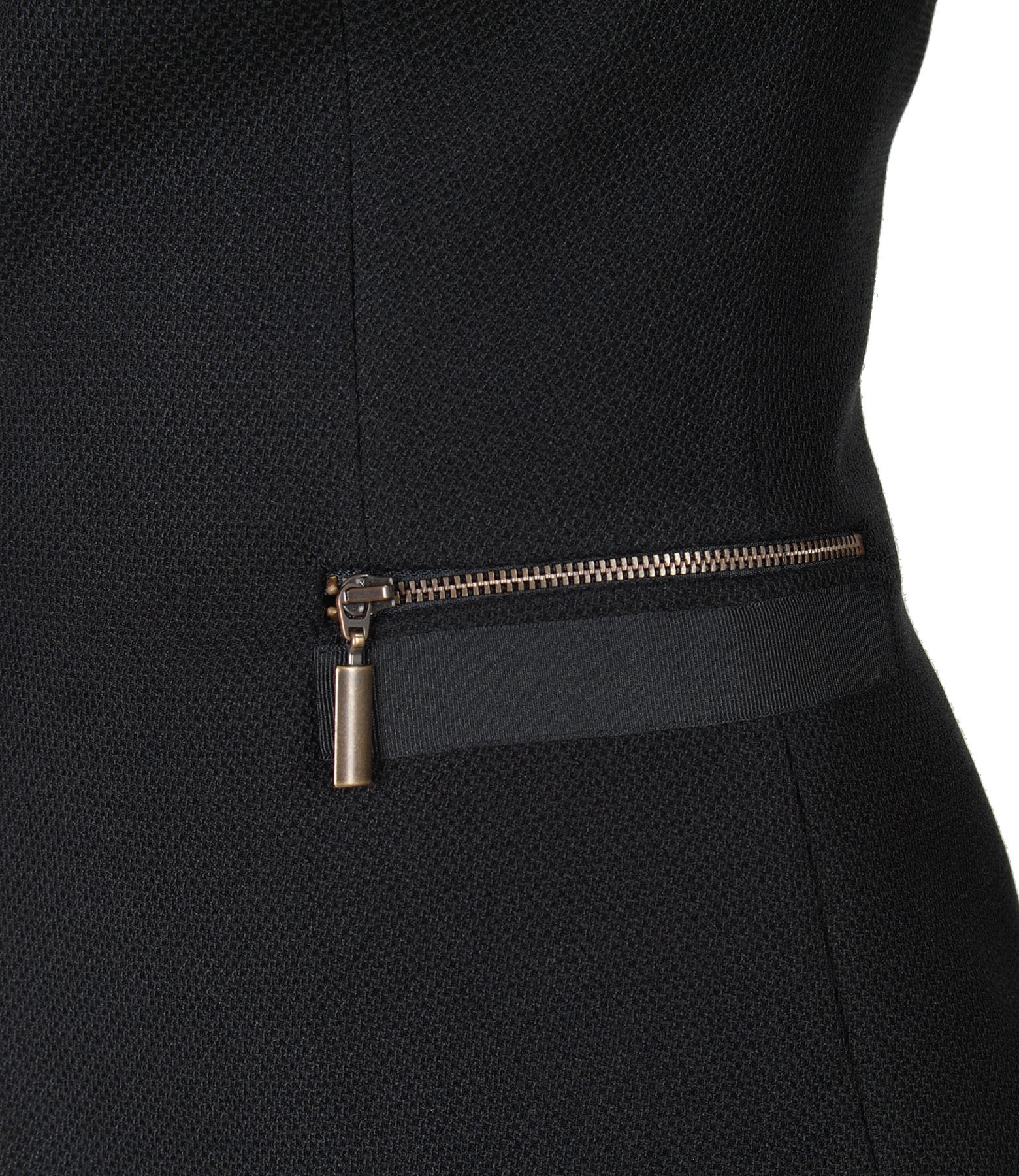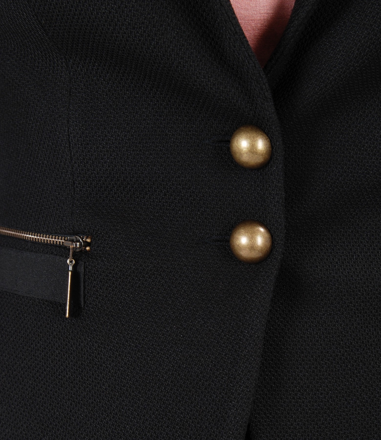 Sacou office din stofa texturata, captusit, cu decolteu adanc, buzunare cu fermoar in talie si banda de rips. Se inchide cu doi nasturi pe fata.