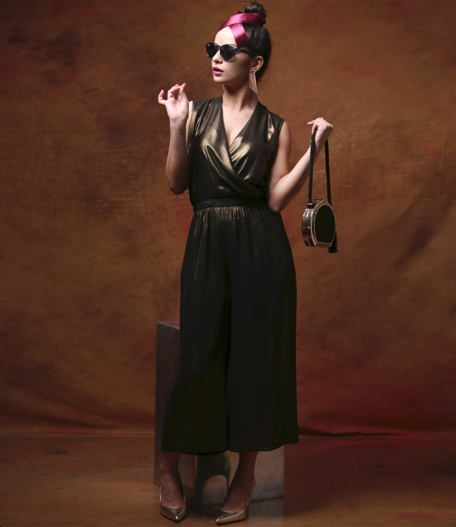 Salopeta 3/4 din voal cu efect sidefat, captusita, cu buzunare laterale si garnitura pretioasa in talie. Se inchide cu fermoar ascuns pe mijloc spate.