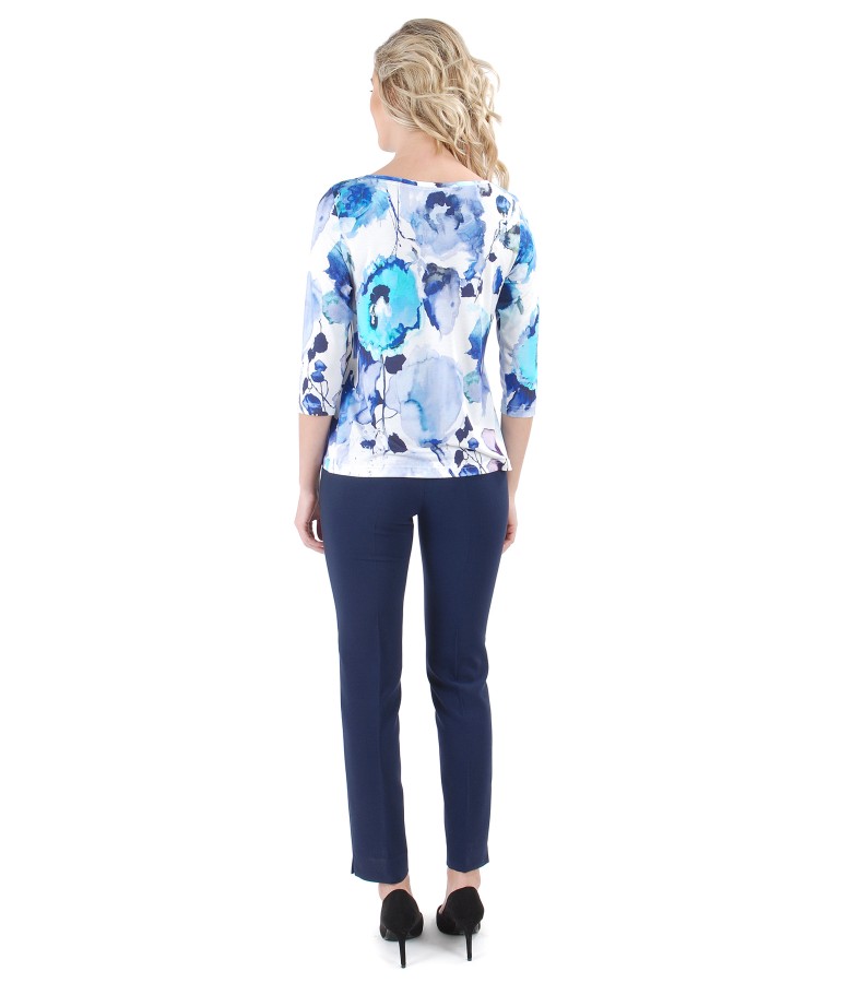 Bluza din jerse elastic imprimat digital cu motive florale, cu decolteu barcuta, maneci 3/4. Pozitia imprimeului variaza per produs.