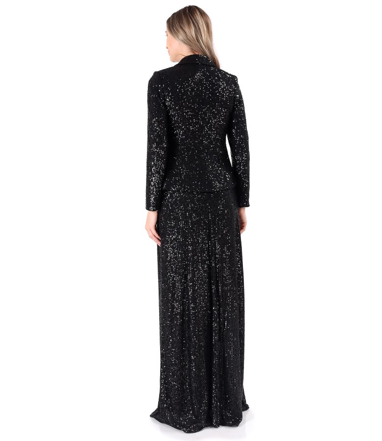 Tinuta de ocazie cu rochie lunga si sacou din paiete negre
