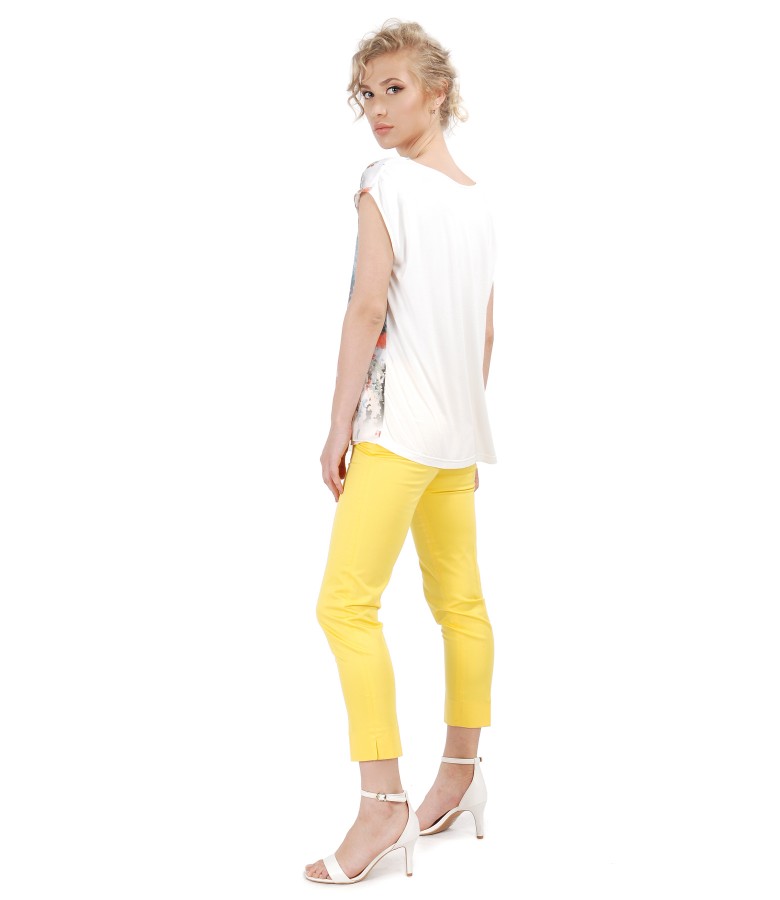 Tinuta eleganta cu pantaloni pana si bluza cu fata din voal imprimat