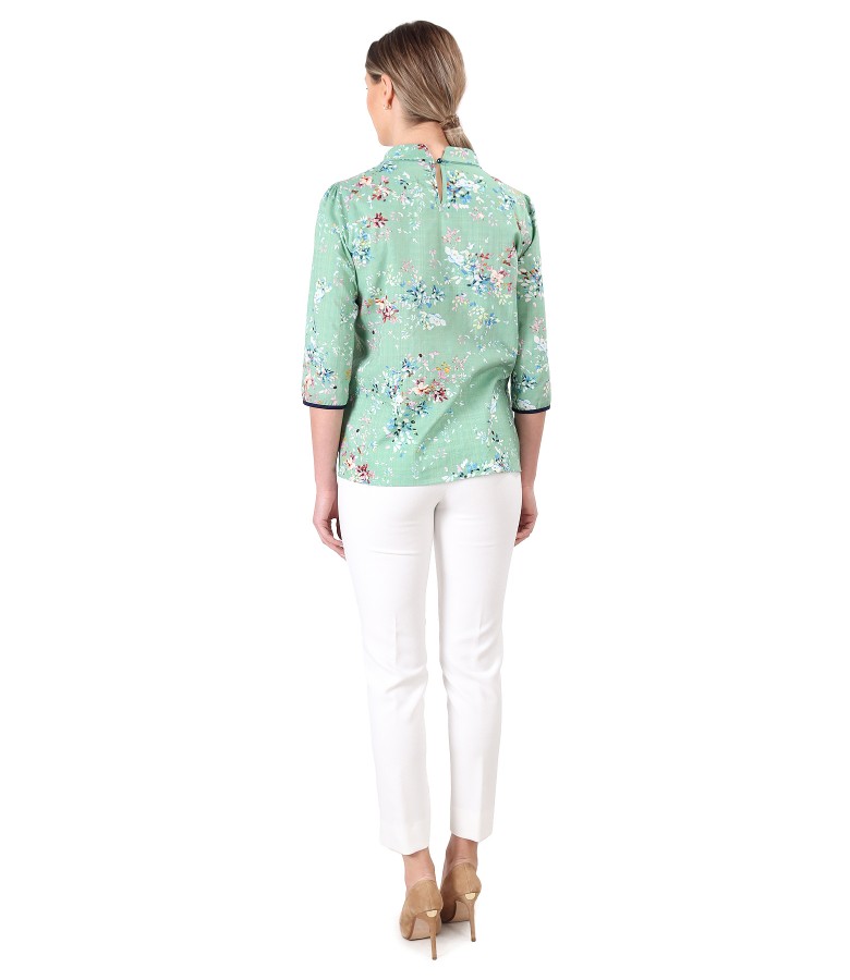 Bluza lejera din bumbac cu viscoza imprimata cu motive florale, maneci 3/4 incretite la terminatie, cu fald pe mijloc fata si funda din rips la decolteu.