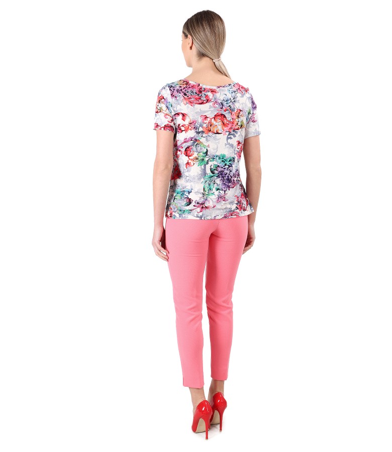 Bluza din jerse elastic din viscoza si in, imprimat cu motive florale, cu decolteu rotund si maneci scurte.
