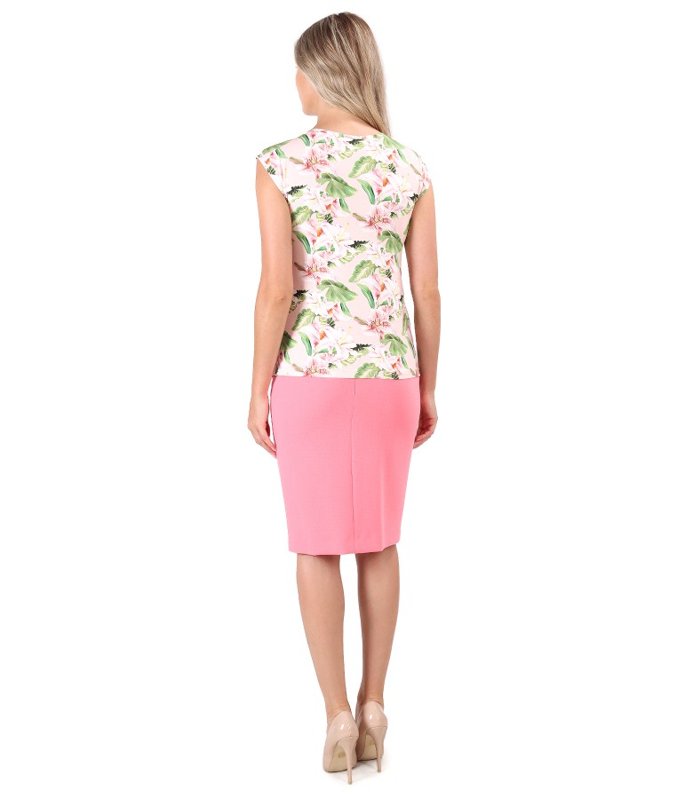 Tinuta office cu bluza din jerse elastic imprimat cu flori si fusta cu fermoar pe fata