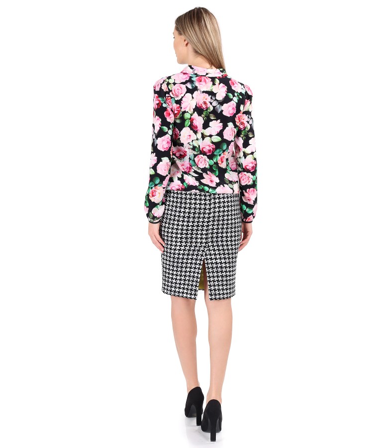 Tinuta office cu fusta din bucle si bluza din saten de viscoza cu guler tip esarfa