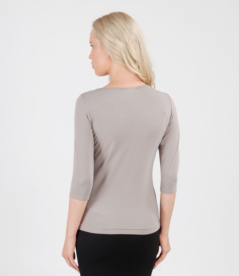 Tricou din jerse elastic uni cu jabou de voal, decolteu rotund si maneci 3/4.