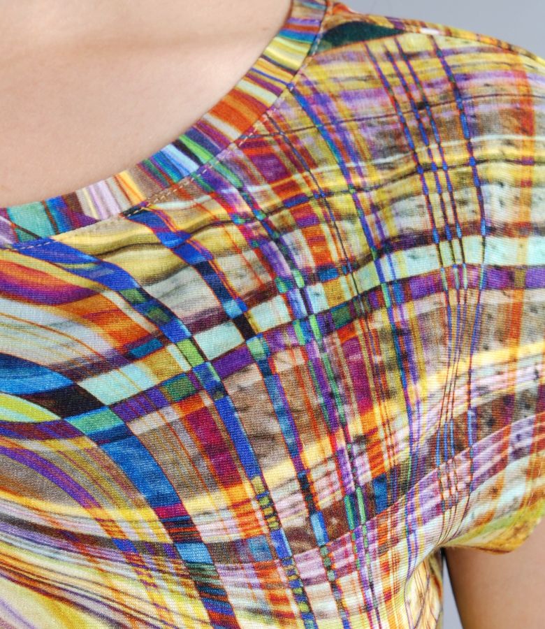 Tricou cu decolteu barcuta, din jerse imprimat, cu umeri cazuti. Pozitia imprimeului difera per produs.