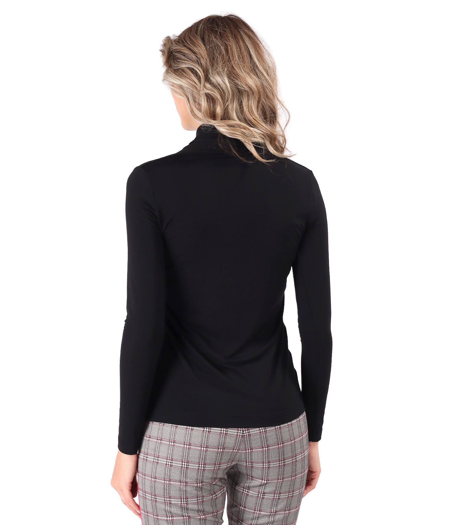 Bluza din jerse elastic uni, cu decolteu adanc, taiat pe mijloc fata, cu maneci lungi si guler fals din prelungirea umarului.